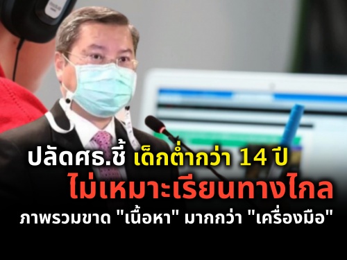 “ปลัด ศธ.” ชี้การเรียนทางไกล ไม่เหมาะกับเด็กอายุต่ำกว่า 14 ปี มองภาพรวมการศึกษาไทย ยังไม่มีความพร้อมจัดการศึกษาทางไกล ที่ไม่ได้ขึ้นอยู่กับเครื่องมือเท่านั้น แต่เป็นคอนเทนต์ ขณะเดียวกัน พบเด็กกว่าร้อยละ 70 ไม่มีทรัพยากรเพียงพอเรียนทางไกล