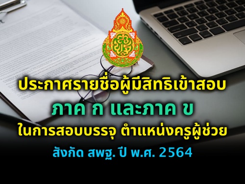 ประกาศรายชื่อผู้มีสิทธิเข้าสอบ ภาค ก และภาค ข ในการสอบแข่งขันเพื่อบรรจุและแต่งตั้งบุคคลเพื่อเข้ารับราชการ เป็นข้าราชการครูและบุคลากรทางการศึกษา ตำแหน่งครูผู้ช่วย สังกัด สพฐ. ปี พ.ศ. 2564