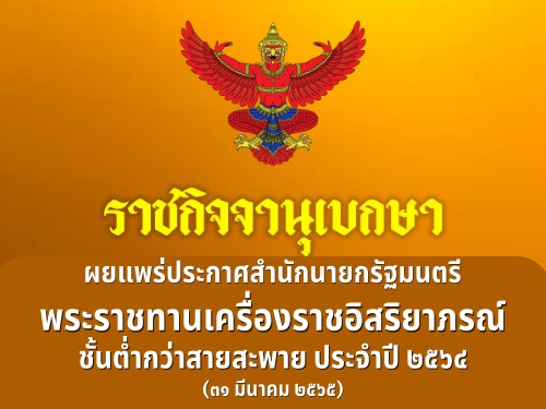 ราชกิจจานุเบกษา เผยแพร่ประกาศสำนักนายกรัฐมนตรี เรื่อง พระราชทานเครื่องราชอิสริยาภรณ์ ประจำปี 2564 (31 มี.ค.2565)