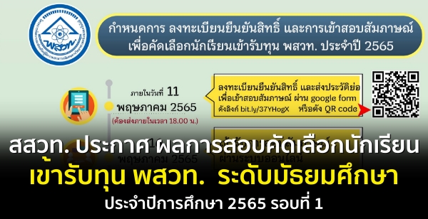 สถาบันส่งเสริมการสอนวิทยาศาสตร์และเทคโนโลยี (สสวท.) ประกาศผลการสอบคัดเลือกนักเรียนเข้ารับทุนพัฒนาและส่งเสริมผู้มีความสามารถพิเศษ ทางวิทยาศาสตร์และเทคโนโลยี (พสวท.) ระดับมัธยมศึกษา ประจำปีการศึกษา 2565 รอบที่ 1 บัดนี้ สสวท. ได้ดำเนินการตรวจและประมวลผลการสอบ รอบที่ 1 เรียบร้อยแล้ว จึงประกาศรายชื่อนักเรียนที่มีสิทธิ์เข้าสอบสัมภาษณ์ จำนวน 103 คน รายละเอียดดังแนบ ไฟล์ ประกาศรายชื่อผู้มีสิทธิ์เข้าสอบสัมภาษณ์ เพื่อรับทุน พสวท. ปี 2565 คลิกดูประกาศ