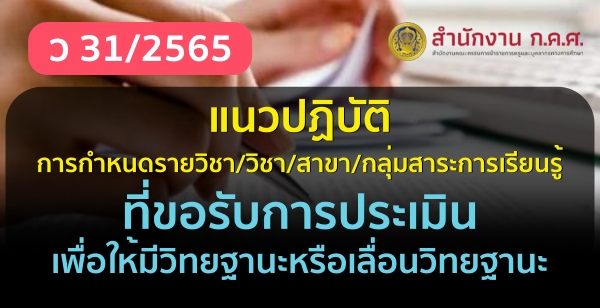 ว 31/2565 แนวปฏิบัติการกำหนดรายวิชา/วิชา/สาขา/กลุ่มสาระการเรียนรู้ ที่ขอรับการประเมินเพื่อให้มีวิทยฐานะหรือเลื่อนวิทยฐานะ