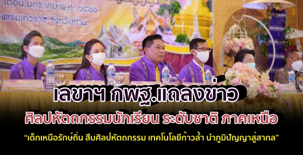 วันที่ 20 มกราคม 2566 นายอัมพร พินะสา เลขาธิการคณะกรรมการการศึกษาขั้นพื้นฐาน (เลขาธิการ กพฐ.) เป็นประธานการแถลงข่าวการเตรียมความพร้อมจัดการแข่งขันศิลปหัตถกรรมนักเรียน ระดับชาติ ครั้งที่ 70 ปีการศึกษา 2565 ภาคเหนือ “เด็กเหนือรักษ์ถิ่น สืบศิลป์หัตถกรรม เทคโนโลยีก้าวล้ำ นำภูมิปัญญาสู่สากล” โดยมี นายวิบูรณ์ แววบัณฑิต ผู้ว่าราชการจังหวัดน่าน ผู้อำนวยการสำนักบริหารงานการศึกษาพิเศษ ผู้อำนวยการสำนักงานเขตพื้นที่การศึกษาประถมศึกษาน่านเขต 1 ผู้อำนวยการสำนักงานเขตพื้นที่การศึกษาประถมศึกษาน่านเขต 2 ผู้อำนวยการสำนักงานเขตพื้นที่การศึกษามัธยมศึกษาน่าน นายกเทศมนตรีเมืองน่าน ผู้บังคับการตำรวจภูธรจังหวัดน่าน นายแพทย์สาธารณสุขจังหวัดน่าน และประธานหอการค้าจังหวัดน่าน ร่วมกันแถลงความพร้อมของทุกหน่วยงาน เพื่อร่วมกันเป็นเจ้าภาพจัดการแข่งขัน ณ ห้องแกรนด์บอลรูม โรงแรมเทวราช อำเภอเมืองน่าน จังหวัดน่าน