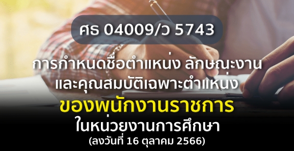 ศธ 04009/ว 5743 การกำหนดชื่อตำแหน่ง ลักษณะงาน และคุณสมบัติเฉพาะตำแหน่งของพนักงานราชการในหน่วยงานการศึกษา (ลงวันที่ 16 ตุลาคม 2566)