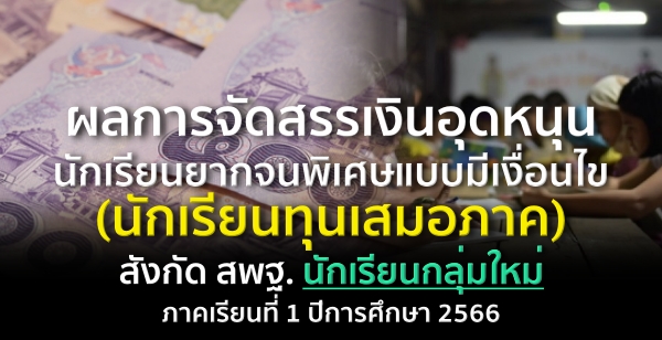 ผลการจัดสรรเงินอุดหนุนนักเรียนยากจนพิเศษแบบมีเงื่อนไข (นักเรียนทุนเสมอภาค) สังกัดสำนักงานคณะกรรมการการศึกษาขั้นพื้นฐาน นักเรียนกลุ่มใหม่ ภาคเรียนที่ 1 ปีการศึกษา 2566