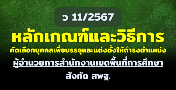 ว 11/2567 หลักเกณฑ์และวิธีการคัดเลือกบุคคลเพื่อบรรจุและแต่งตั้งให้ดำรงตำแหน่งผู้อำนวยการสำนักงานเขตพื้นที่การศึกษา สังกัดสำนักงานคณะกรรมการการศึกษาขั้นพื้นฐาน