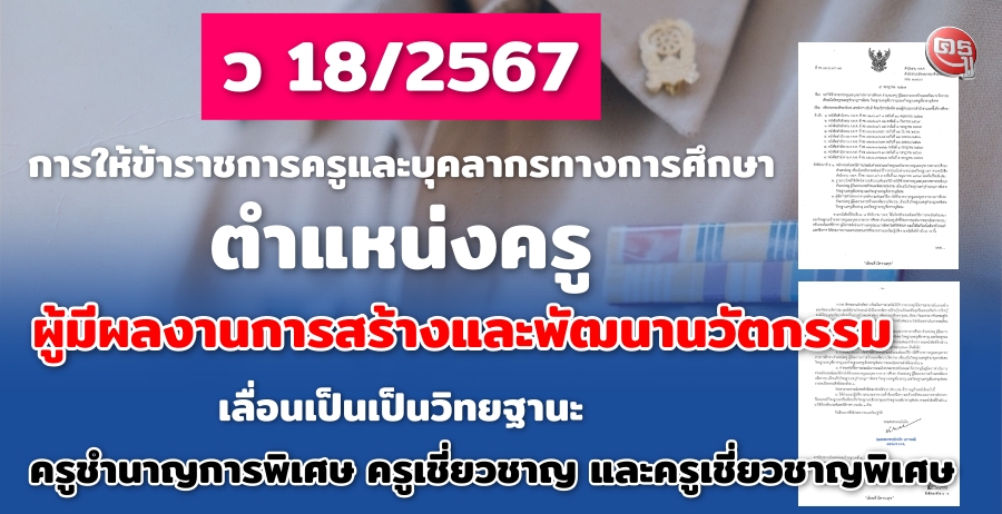 ว 18/2567 การให้ข้าราชการครูและบุคลากรทางการศึกษา ตำแหน่งครู ผู้มีผลงานการสร้างและพัฒนานวัตกรรม เลื่อนเป็นเป็นวิทยฐานะครูชำนาญการพิเศษ วิทยฐานะครูเชี่ยวชาญ และวิทยฐานะครูเชี่ยวชาญพิเศษ
