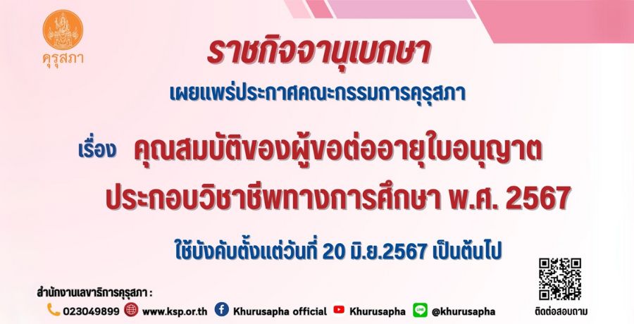 ราชกิจจานุเบกษาเผยแพร่ประกาศคณะกรรมการคุรุสภา เรื่อง คุณสมบัติของผู้ขอต่ออายุใบอนุญาตประกอบวิชาชีพทางการศึกษา พ.ศ. 2567