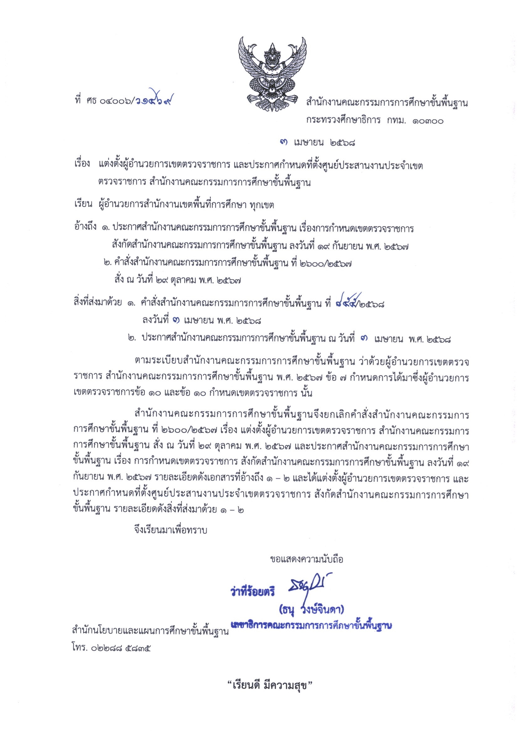 เมื่อวันที่ 3 เมษายน 2568 สำนักงานคณะกรรมการการศึกษาขั้นพื้นฐาน มีหนังสือ ที่ ศธ 04006/ว1469 เรื่อง แต่งตั้งผู้อำนวยการเขตตรวจราชการ และกำหนดที่ตั้งศูนย์ประสานงานประจำเขตตรวจราชการ สังกัดสำนักงานคณะกรรมการการศึกษาขั้นพื้นฐาน