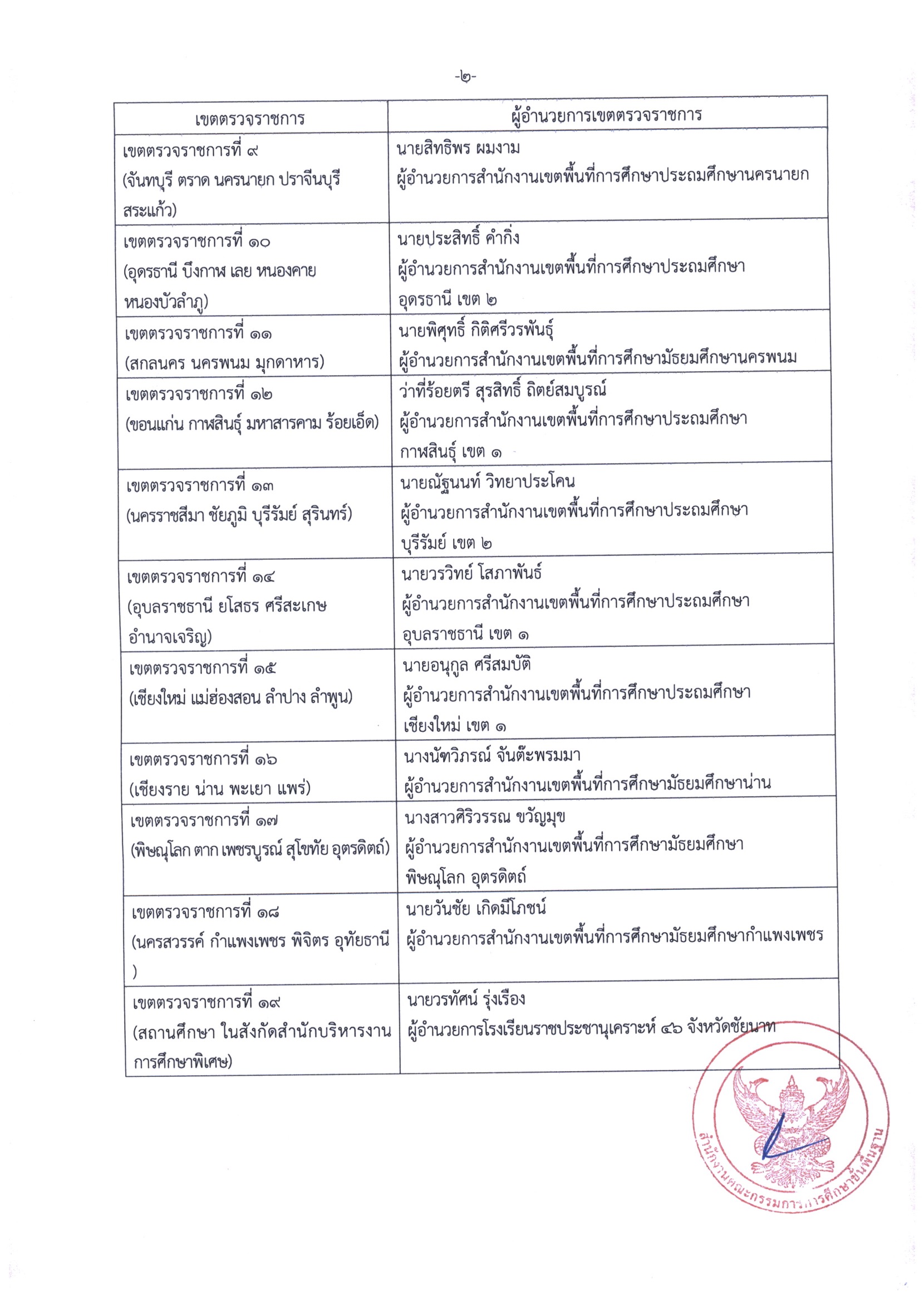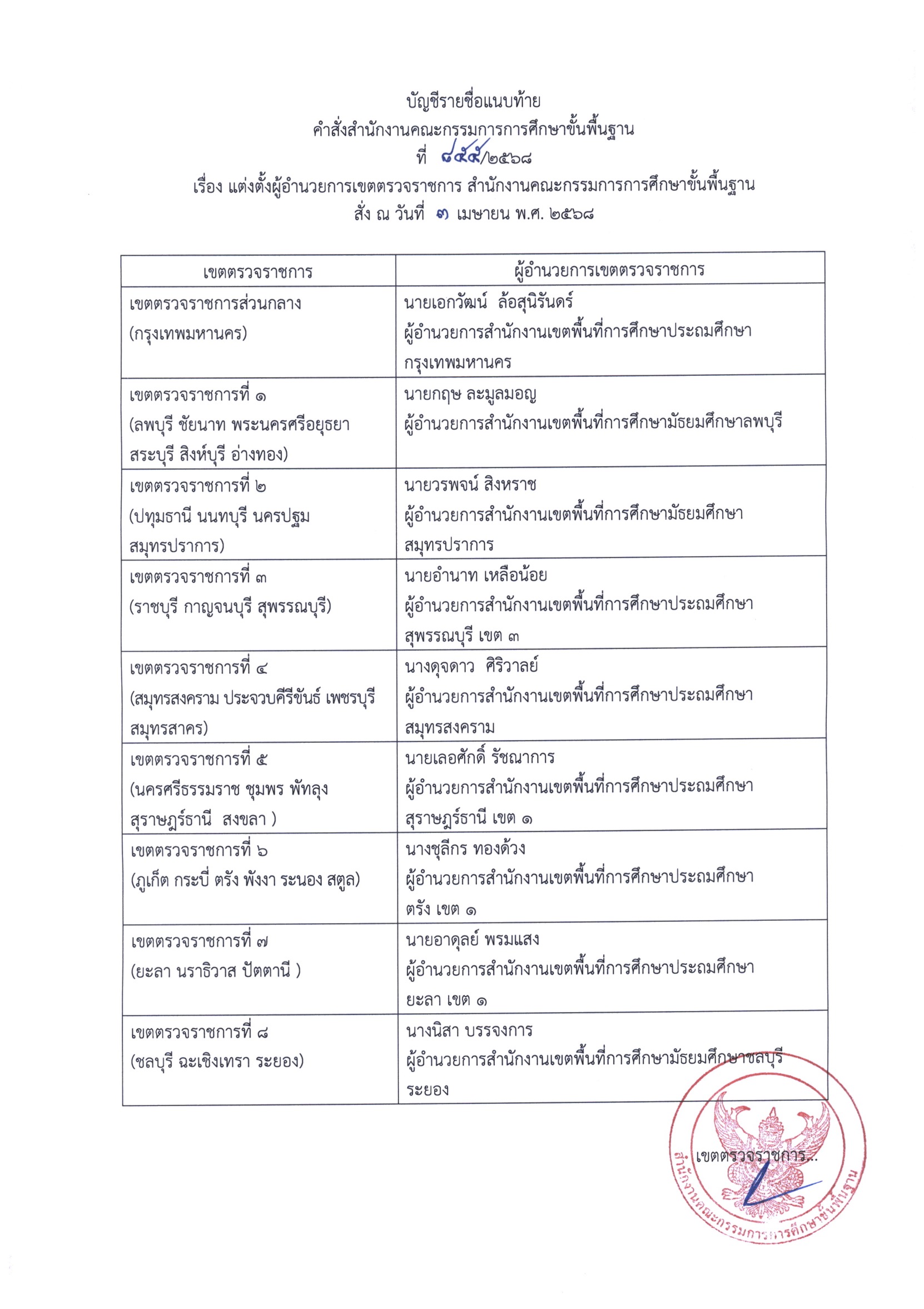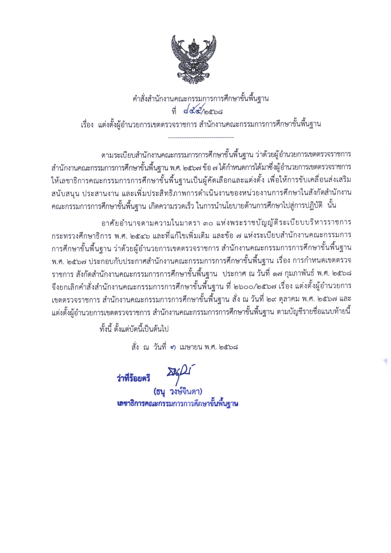 อาศัยอำนาจตามความในมาตรา 30 แห่งพระราชบัญญัติระเบียบบริหารราชการ กระทรวงศึกษาธิการ พ.ศ. 2546 และที่แก้ไขเพิ่มเติม และข้อ 7 แห่งระเบียบสำนักงานคณะกรรมการการศึกษาขั้นพื้นฐาน ว่าด้วยผู้อำนวยการเขตตรวจราชการ สำนักงานคณะกรรมการการศึกษาขั้นพื้นฐานพ.ศ. 2567 ประกอบกับประกาศสำนักงานคณะกรรมการการศึกษาขั้นพื้นฐาน เรื่อง การกำหนดเขตตรวจราชการ สังกัดสำนักงานคณะกรรมการการศึกษาขั้นพื้นฐาน ประกาศ ณ วันที่ 17 กุมภาพันธ์ พ.ศ. 2568 จึงยกเลิกคำสั่งสำนักงานคณะกรรมการการศึกษาขั้นพื้นฐาน ที่ 260/2567 เรื่อง แต่งตั้งผู้อำนวยการ เขตตรวจราชการ สำนักงานคณะกรรมการการศึกษาขั้นพื้นฐานสั่ง ณ วันที่ 29 ตุลาคม พ.ศ. 2567 และแต่งตั้งผู้อำนวยการเขตตรวจราชการ สำนักงานคณะกรรมการการศึกษาขั้นพื้นฐาน ตามบัญชีรายชื่อแนบท้ายนี้