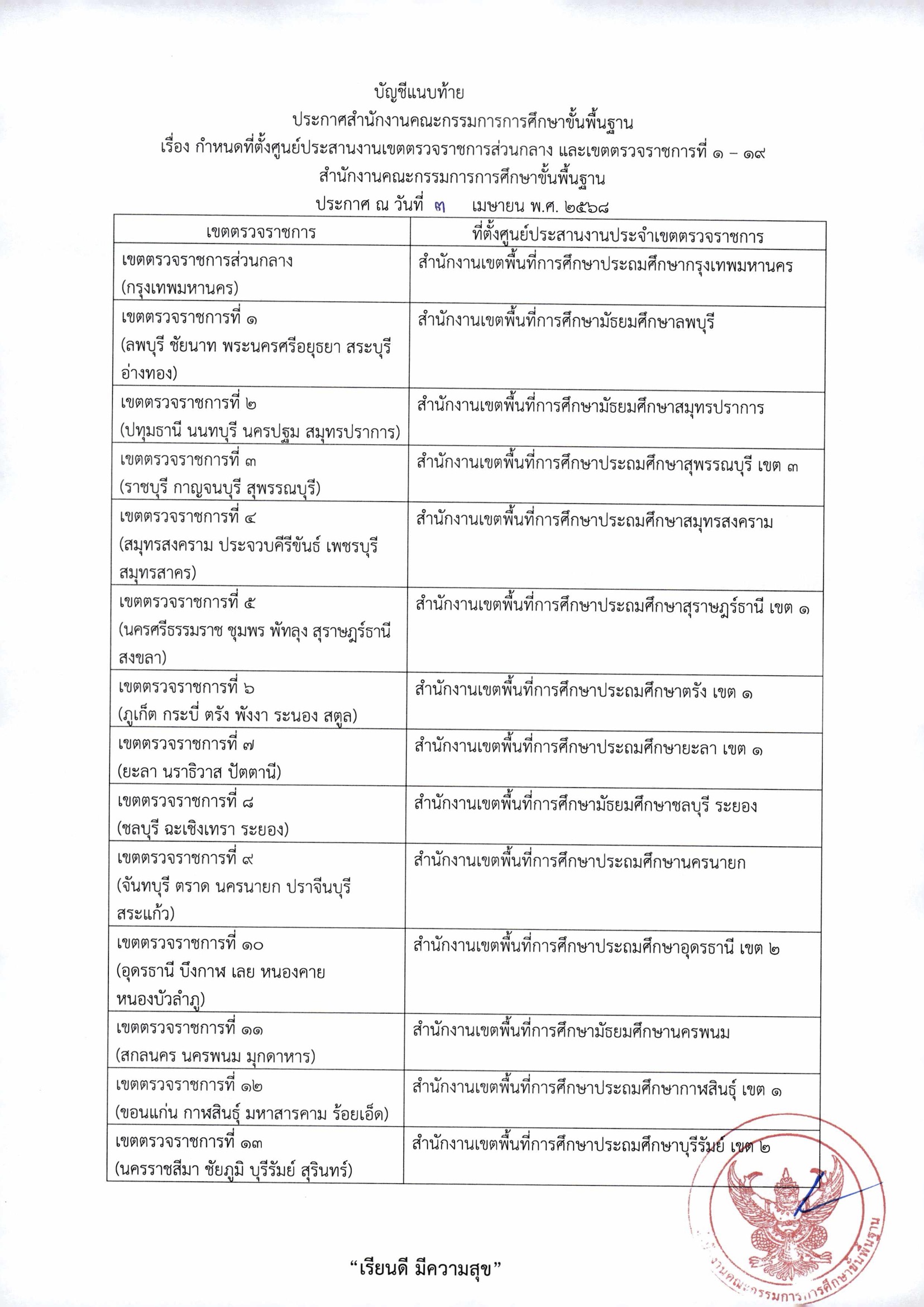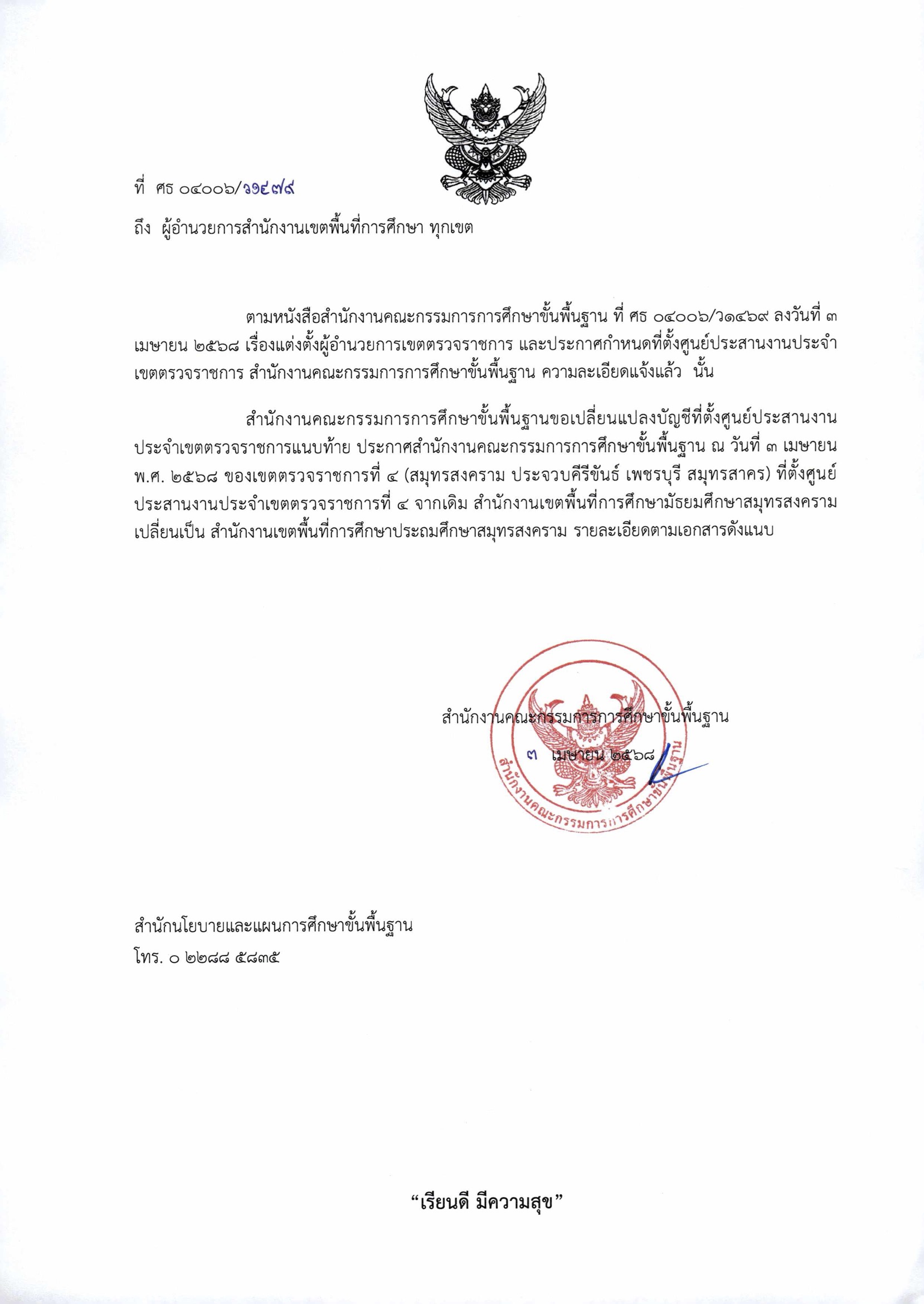และต่อมา สำนักงานคณะกรรมการการศึกษาขั้นพื้นฐาน ได้มีหนังสือ ที่ ศธ 04006/ว1479 เรื่อง ขอเปลี่ยนแปลงบัญชีที่ตั้งศูนย์ประสานงานประจำเขตตรวจราชการแนบท้าย ประกาศสำนักงานคณะกรรมการการศึกษาขั้นพื้นฐาน โดยขอเปลี่ยนแปลงบัญชีที่ตั้งศูนย์ประสานงาน ประจำเขตตรวจราชการแนบท้าย ประกาศสำนักงานคณะกรรมการการศึกษาขั้นพื้นฐาน ณ วันที่ 3 เมษายน พ.ศ. 2568 ของเขตตรวจราชการที่ 4 (สมุทรสงคราม ประจวบคีรีขันธ์ เพชรบุรี สมุทรสาคร) ที่ตั้งศูนย์ประสานงานประจำเขตตรวจราชการที่ 4 จากเดิม สำนักงานเขตพื้นที่การศึกษามัธยมศึกษาสมุทรสงครามเปลี่ยนเป็น สำนักงานเขตพื้นที่การศึกษาประถมศึกษาสมุทรสงคราม รายละเอียดตามเอกสารดังแนบ