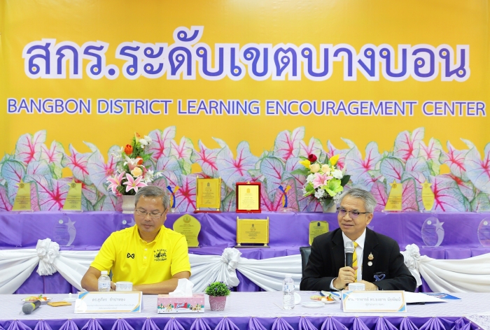 เมื่อเร็ว ๆ นี้ สำนักงานรับรองมาตรฐานและประเมินคุณภาพการศึกษา หรือ สมศ. ลงพื้นที่ทดลองประเมินนำร่องเกี่ยวกับตัวชี้วัดการประกันคุณภาพภายนอก ศูนย์ส่งเสริมการเรียนรู้ระดับเขตบางบอน นำโดยศาสตราจารย์ ดร.องอาจ นัยพัฒน์ (ที่ 6 จากซ้าย) ผู้อำนวยการ สมศ. พร้อมด้วย ดร.สุภัทร จำปาทอง (ที่ 7 จากซ้าย) ประธานคณะอนุกรรมการพัฒนาระบบ กรมส่งเสริมการเรียนรู้ (สกร.) และ ดร.รุ่งอรุณ ไสยโสภณ (ที่ 9 จากซ้าย) อนุกรรมการพัฒนาระบบ สกร. ณ ศูนย์ส่งเสริมการเรียนรู้ระดับเขตบางบอน สำนักงานส่งเสริมการเรียนรู้ประจำกรุงเทพมหานคร