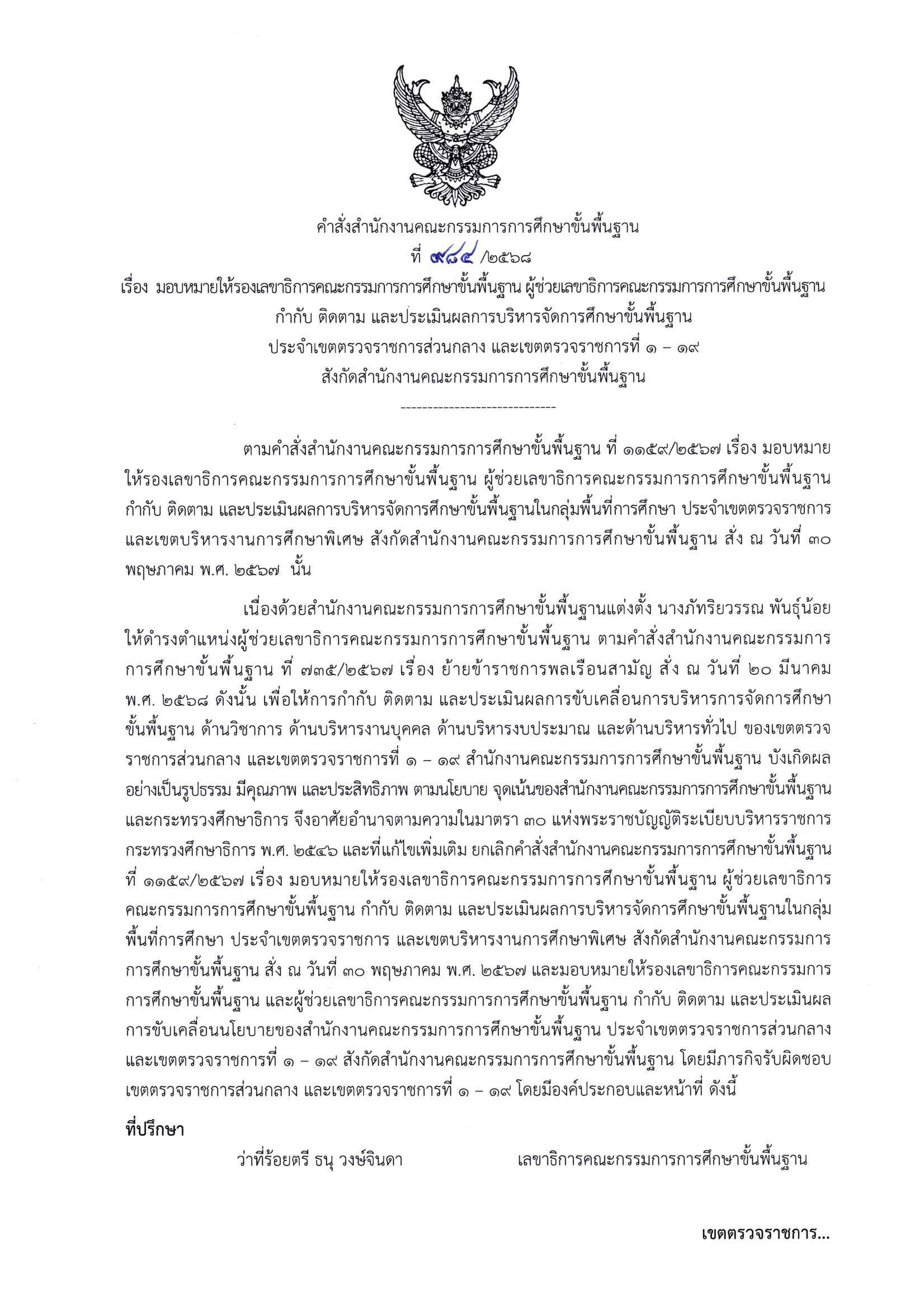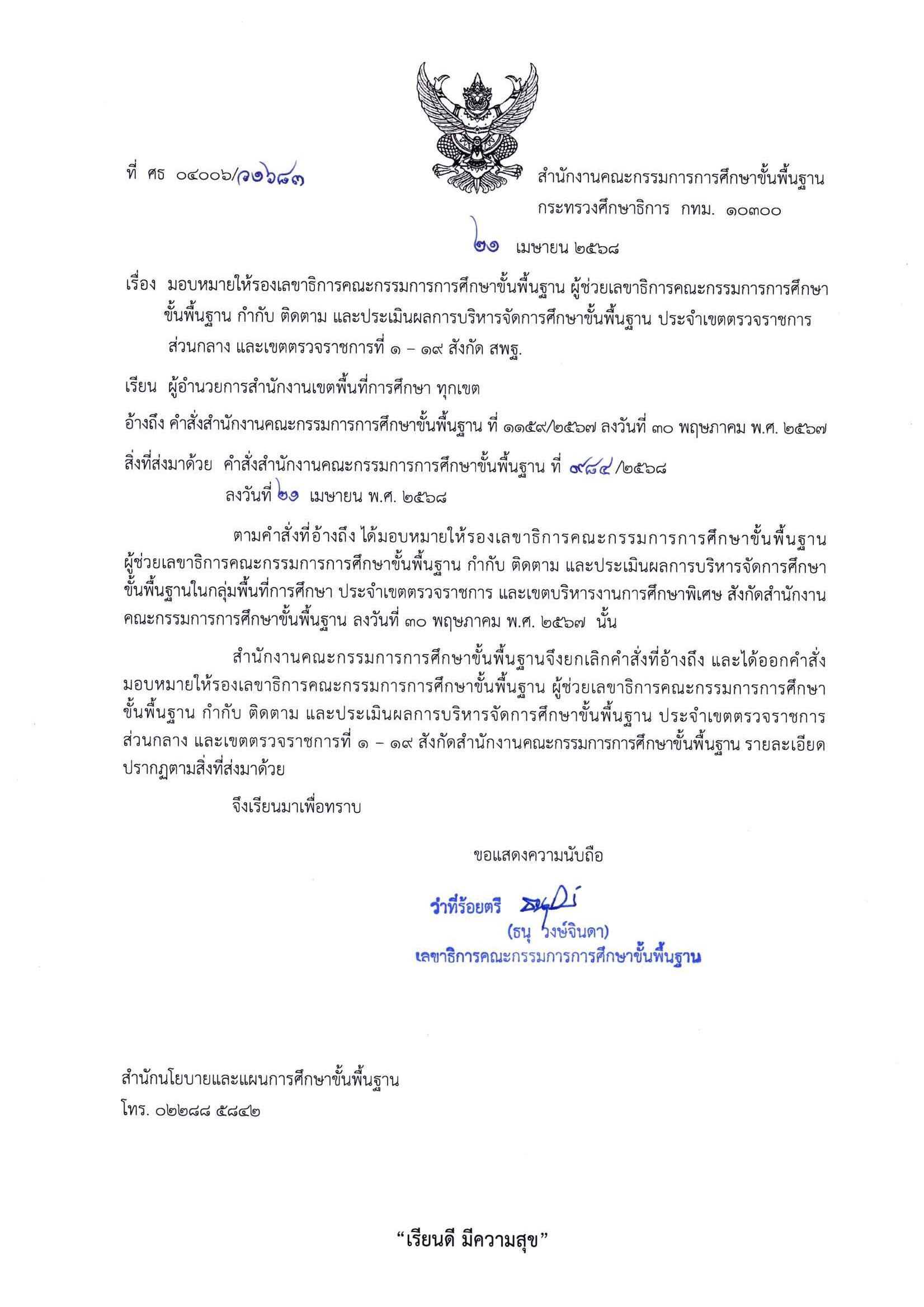 คำสั่ง สำนักงานคณะกรรมการการศึกษาขั้นพื้นฐาน ที่ 974/2568 เรื่อง มอบหมายให้รองเลขาธิการคณะกรรมการการศึกษาขั้นพื้นฐาน ผู้ช่วยเลขาธิการคณะกรรมการการศึกษาขั้นพื้นฐาน กำกับ ติดตาม และประเมินผลการบริหารจัดการศึกษาขั้นพื้นฐาน ประจำเขตตรวจราชการส่วนกลาง และเขตตรวจราชการที่ 1-19 สังกัด สพฐ.