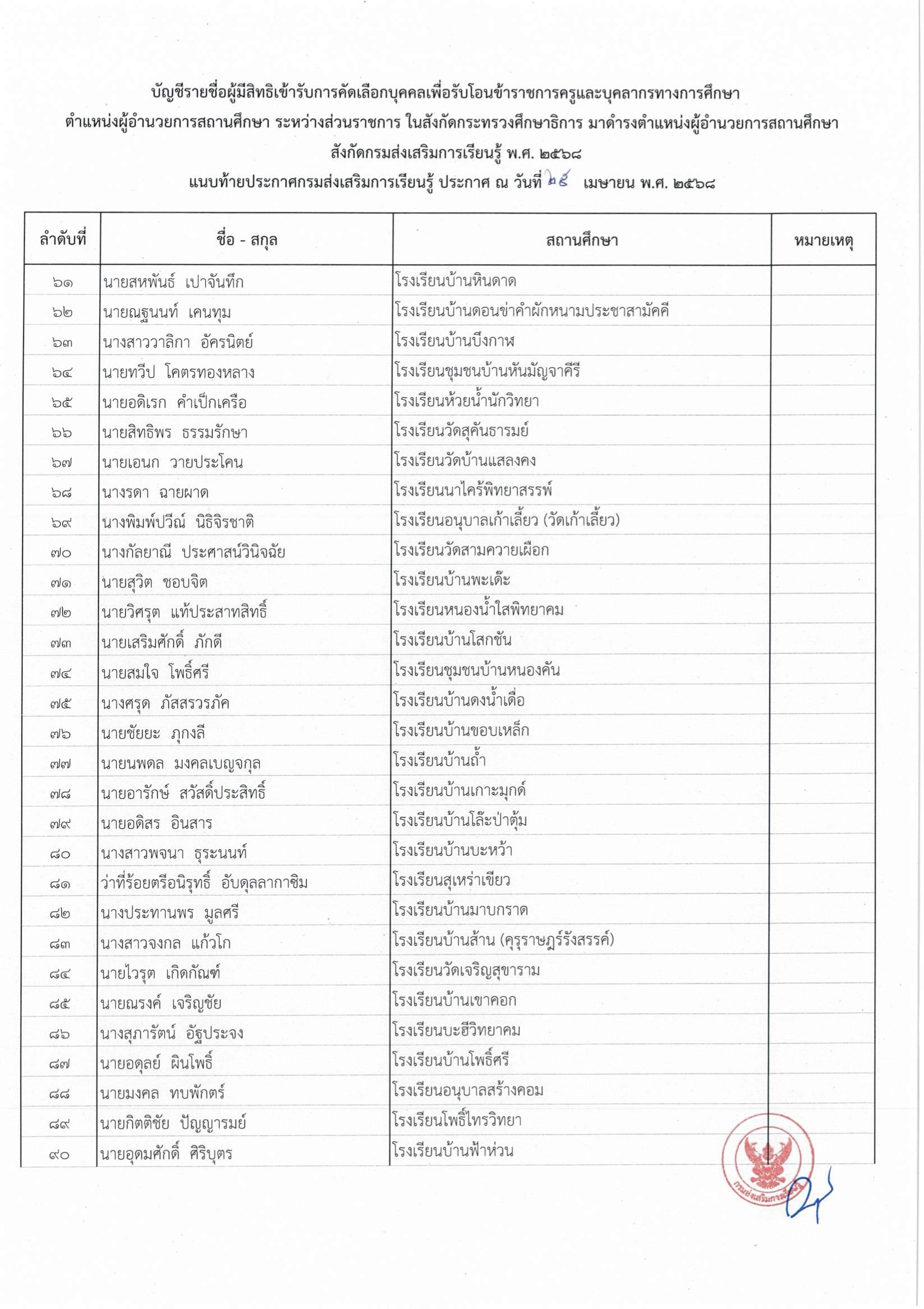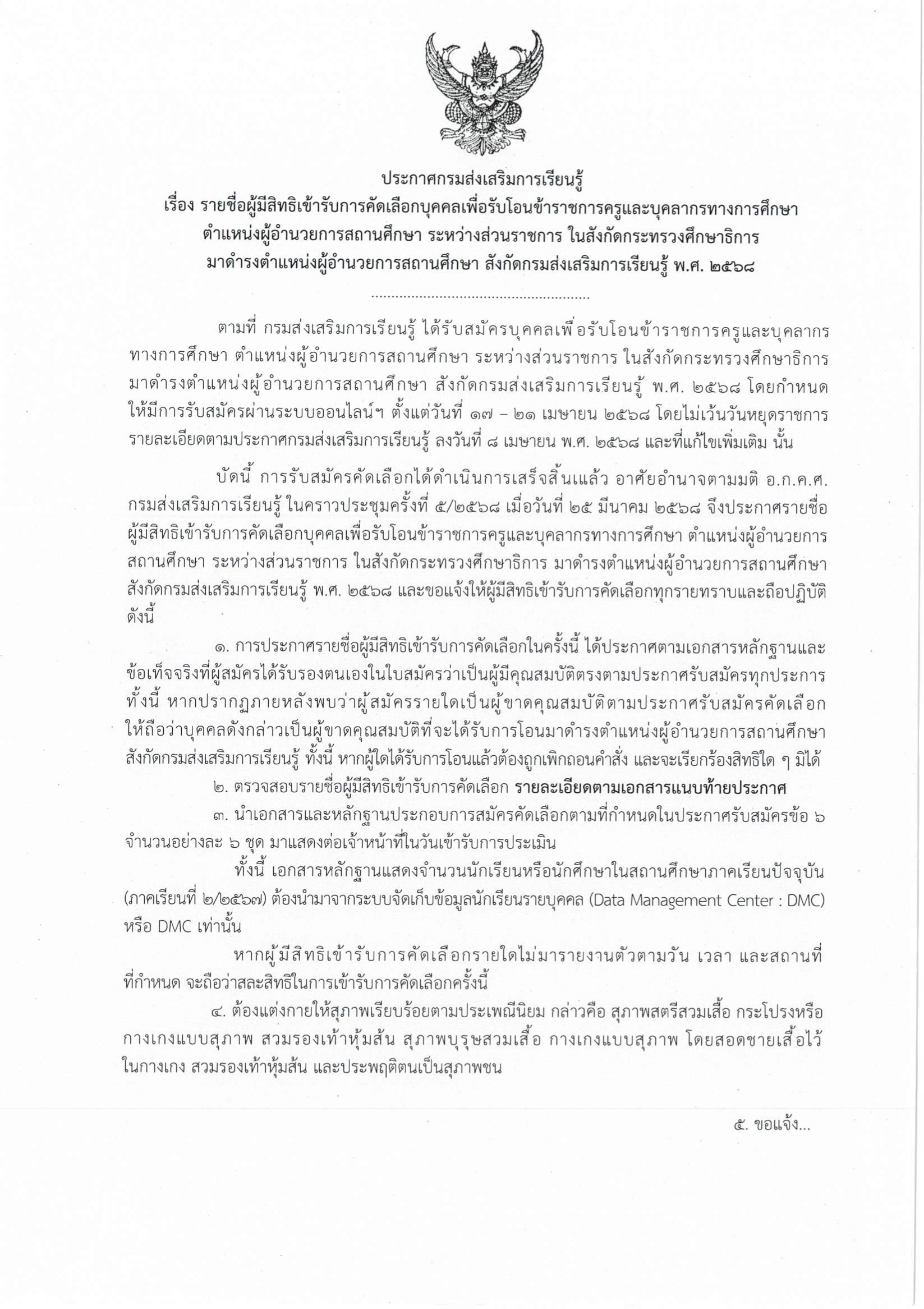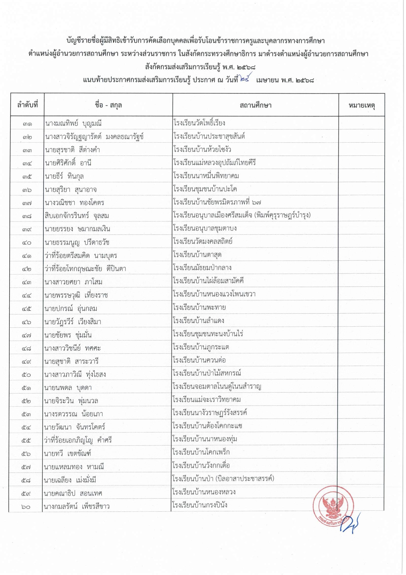 รายชื่อผู้มีสิทธิเข้ารับการคัดเลือกบุคคลเพื่อรับโอนข้าราชการครูและบุคลากรทางการศึกษา ตำแหน่งผู้อำนวยการสถานศึกษา ระหว่างส่วนราชการ ในสังกัดกระทรวงศึกษาธิการ มาดำรงตำแหน่งผู้อำนวยการสถานศึกษา สังกัดกรมส่งเสริมการเรียนรู้ พ.ศ. 2568