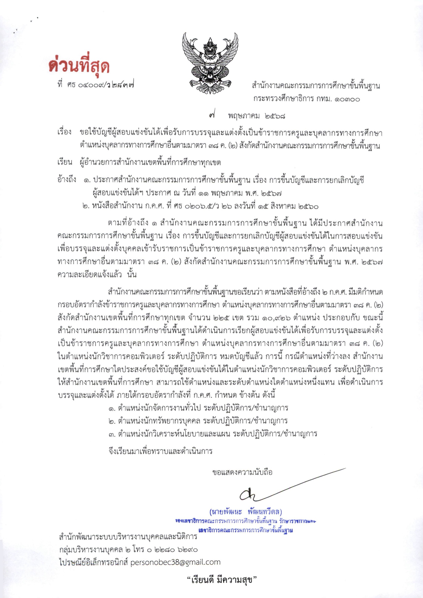 อ้างถึง 1. ประกาศสำนักงานคณะกรรมการการศึกษาขั้นพื้นฐาน เรื่อง การขึ้นบัญชีและการยกเลิกบัญชี ผู้สอบแข่งขันได้ๆ ประกาศ ณ วันที่ 11 พฤษภาคม พ.ศ. 2567