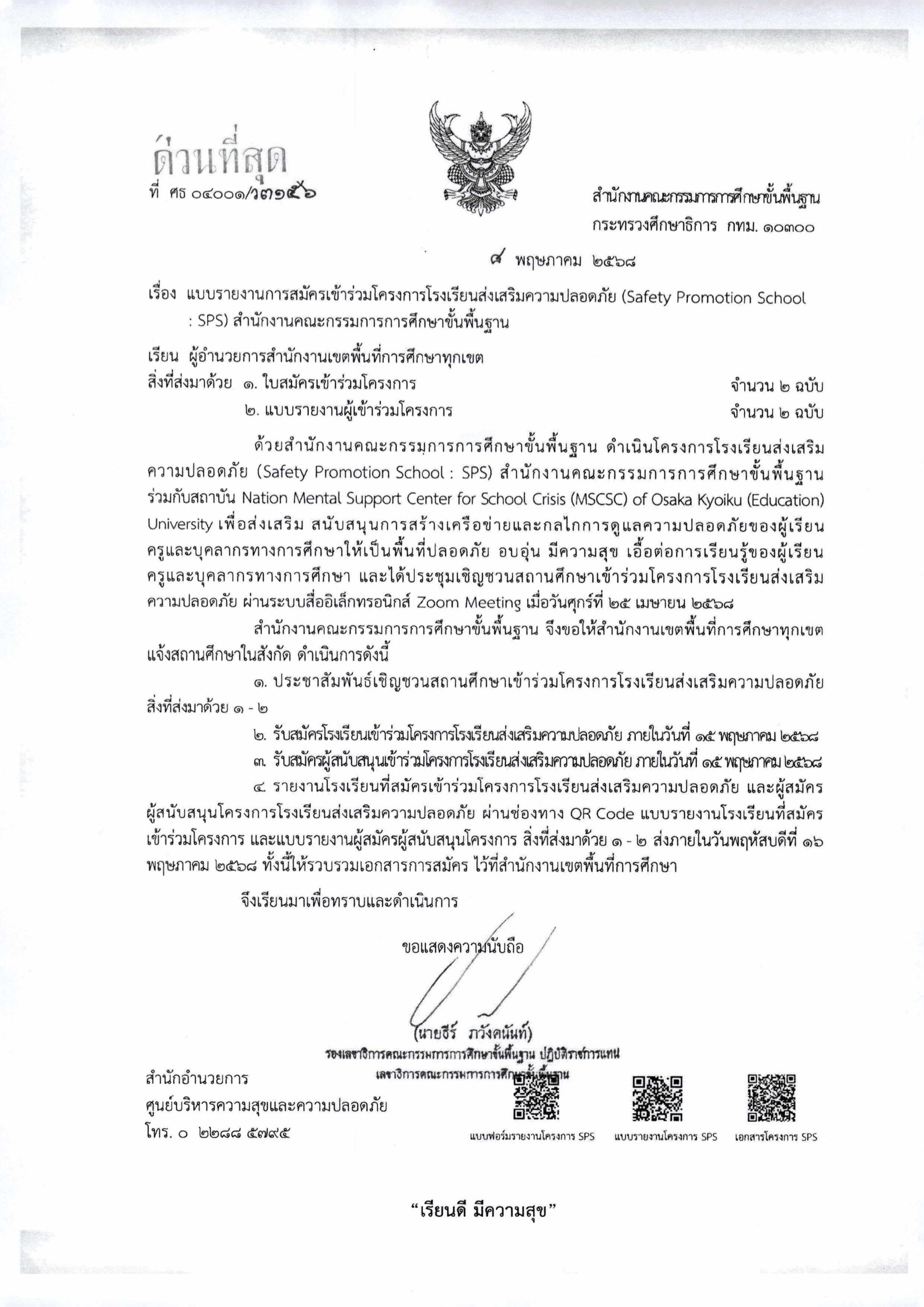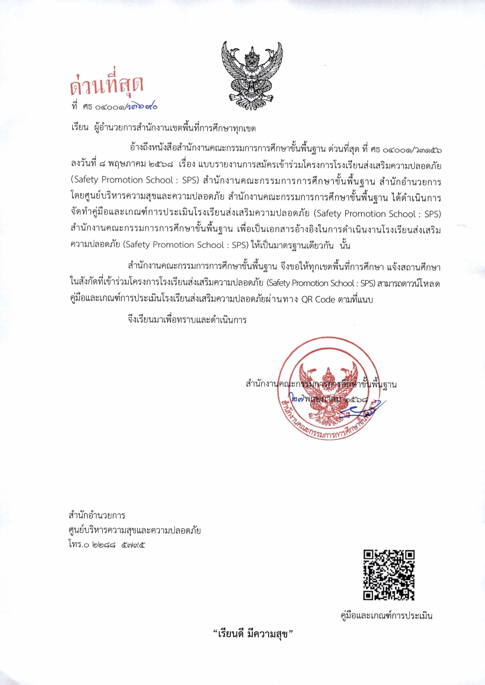 คู่มือและเกณฑ์การประเมินโครงการโรงเรียนส่งเสริมความปลอดภัย (Safety Promotion School :SPS) สำนักงานคณะกรรมการการศึกษาขั้นพื้นฐาน