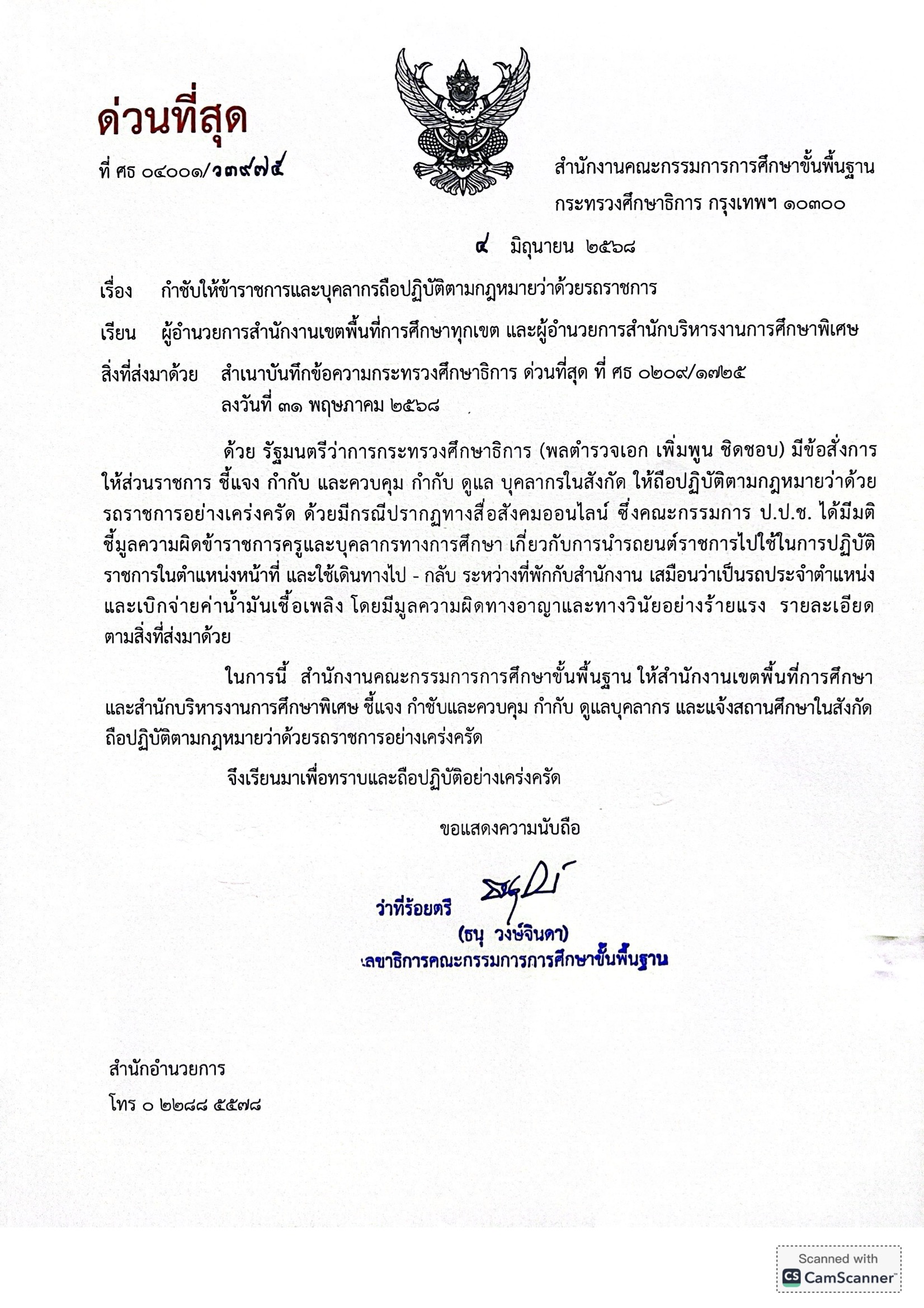 สำนักงานคณะกรรมการการศึกษาขั้นพื้นฐาน มีหนังสือที่ ศธ 04001/ว3975 เรื่อง กำชับให้ข้าราชการและบุคลากรถือปฏิบัติตามกฎหมายว่าด้วยรถราชการ