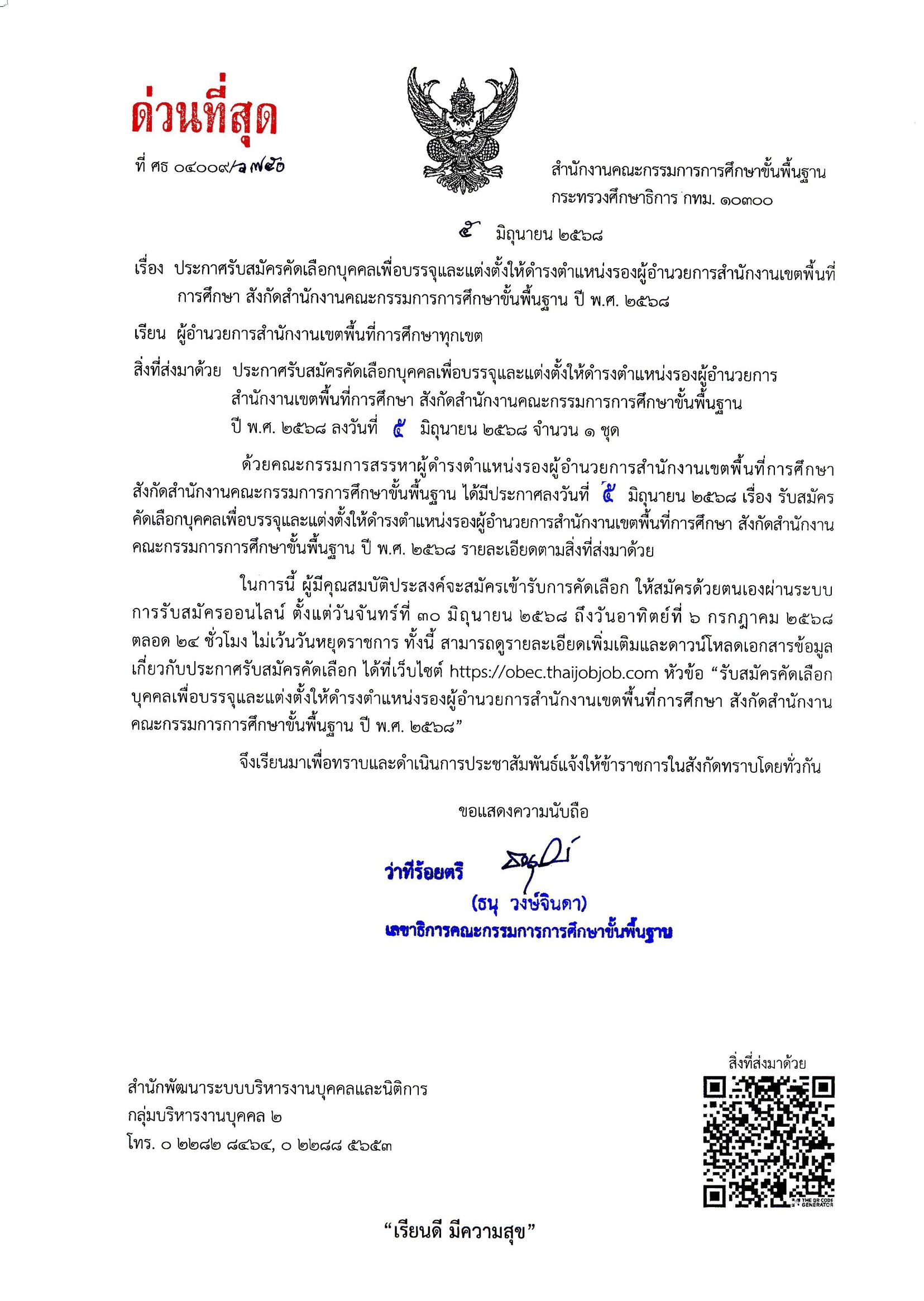 สำนักงานคณะกรรมการการศึกษาขั้นพื้นฐาน (สพฐ.) ได้ออกประกาศรับสมัครคัดเลือกบุคคลเพื่อบรรจุและแต่งตั้งให้ดำรงตำแหน่ง รองผู้อำนวยการสำนักงานเขตพื้นที่การศึกษา ปี พ.ศ. 2568 ประกาศ ลงวันที่ 5 มิถุนายน 2568