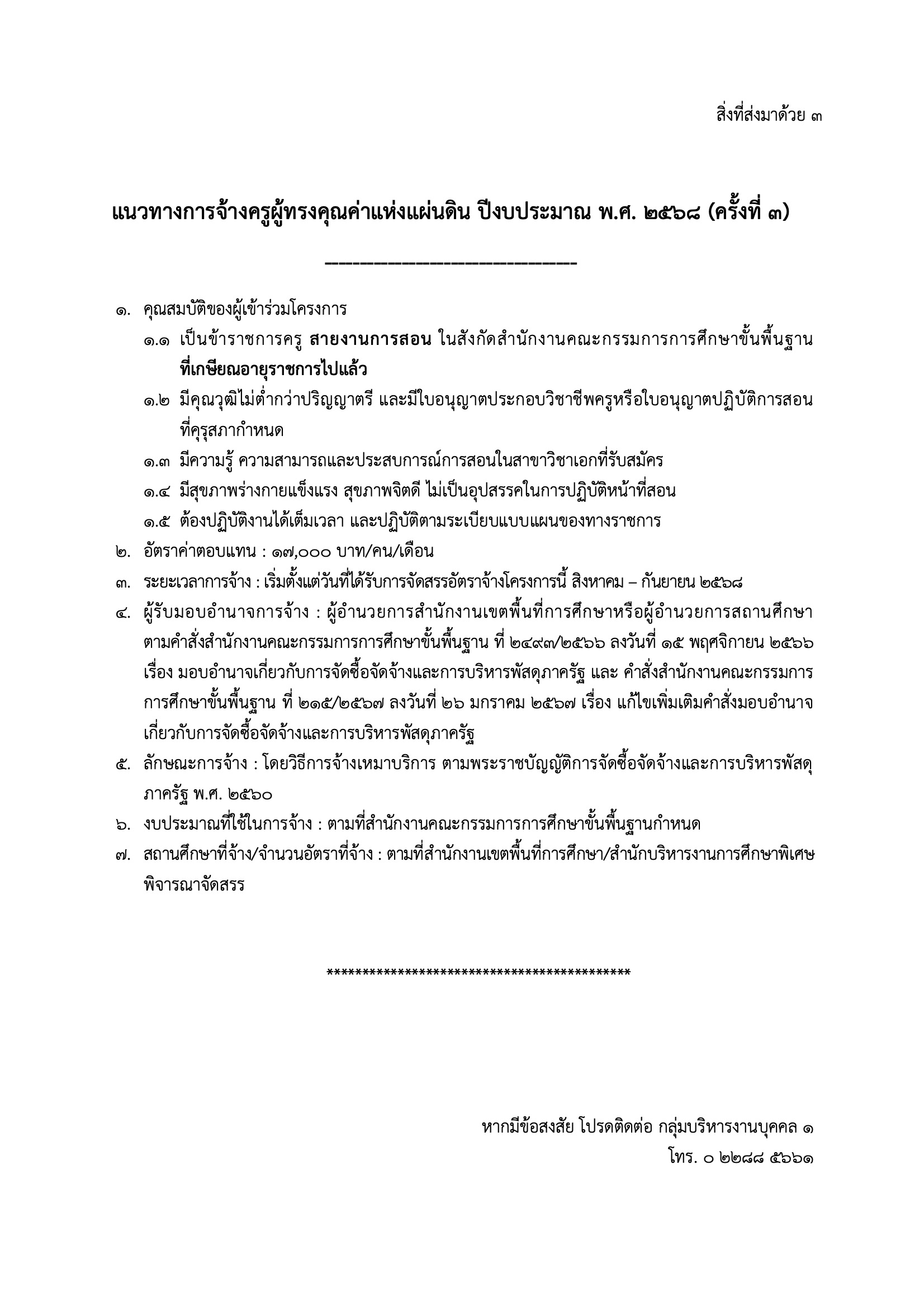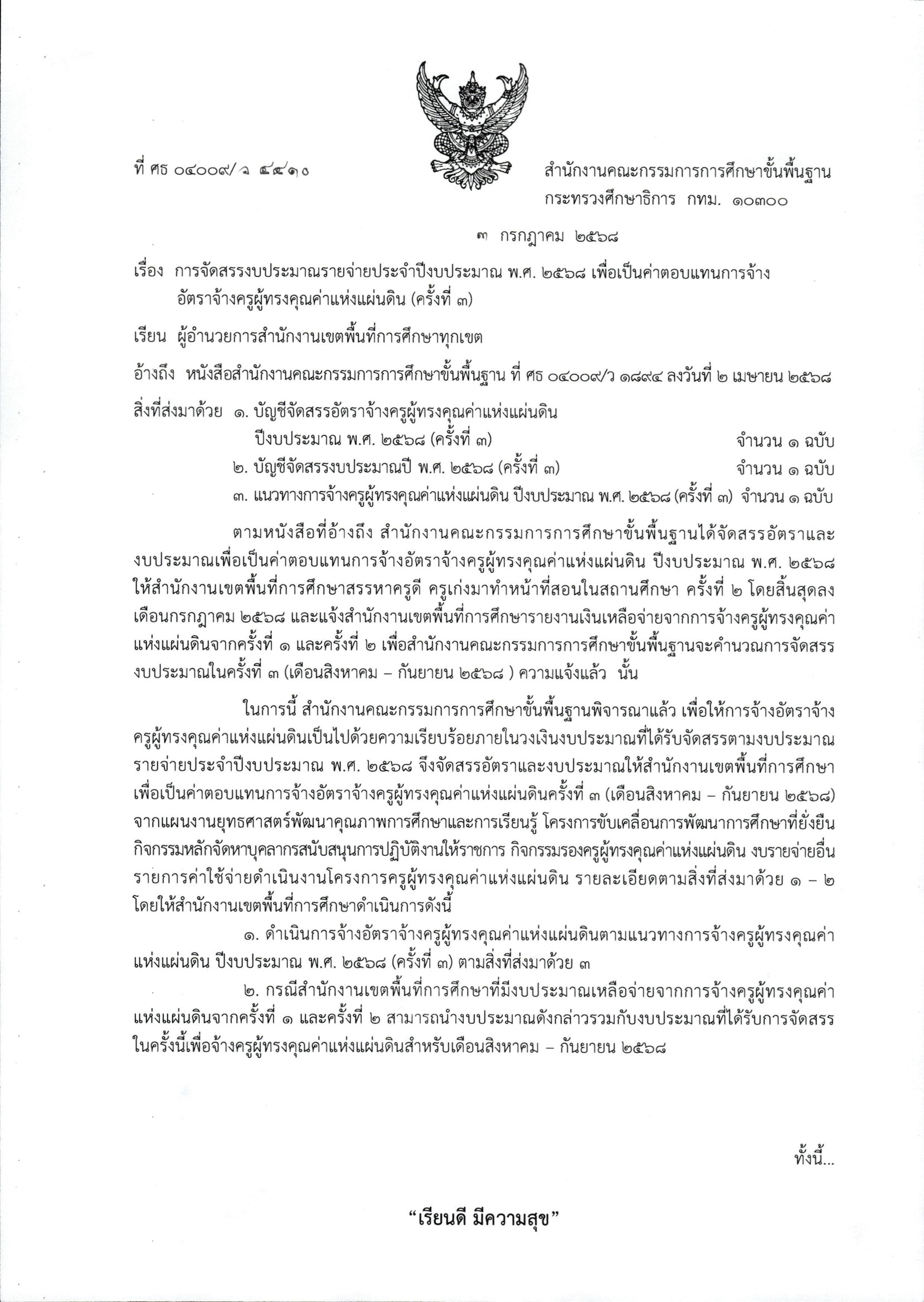 การจัดสรรงบประมาณรายจ่ายประจำปีงบประมาณ พ.ศ. 2568 เพื่อเป็นค่าตอบแทนการจ้างอัตราจ้างครูผู้ทรงคุณค่าแห่งแผ่นดิน (ครั้งที่ 3)
