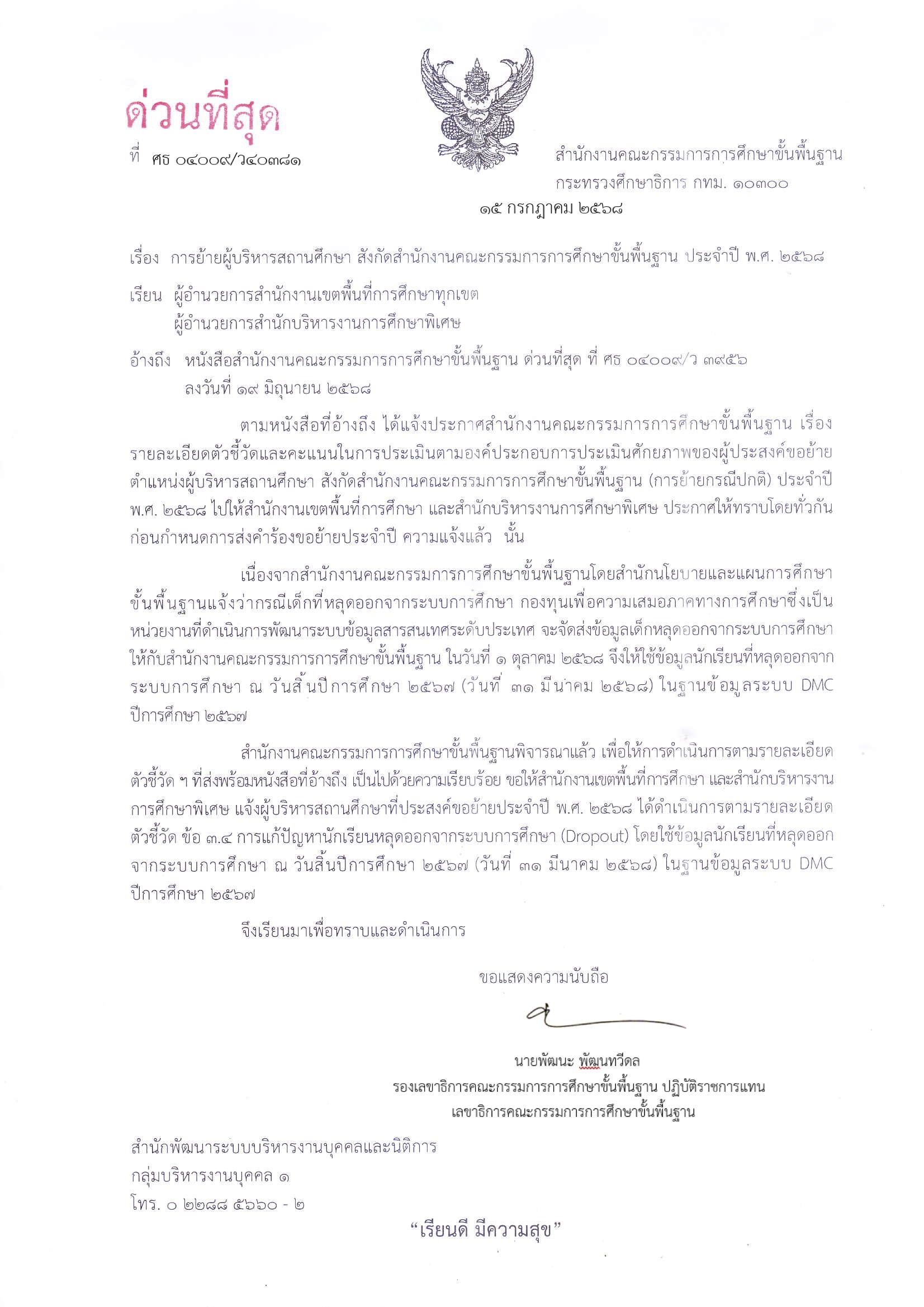 อ้างถึง หนังสือสำนักงานคณะกรรมการการศึกษาขั้นพื้นฐาน ด่วนที่สุด ที่ ศธ ๕๐๐๗๖๓๙๕๖ ลงวันที่ ๑๙ มิถุนายน ๒๕๖๘