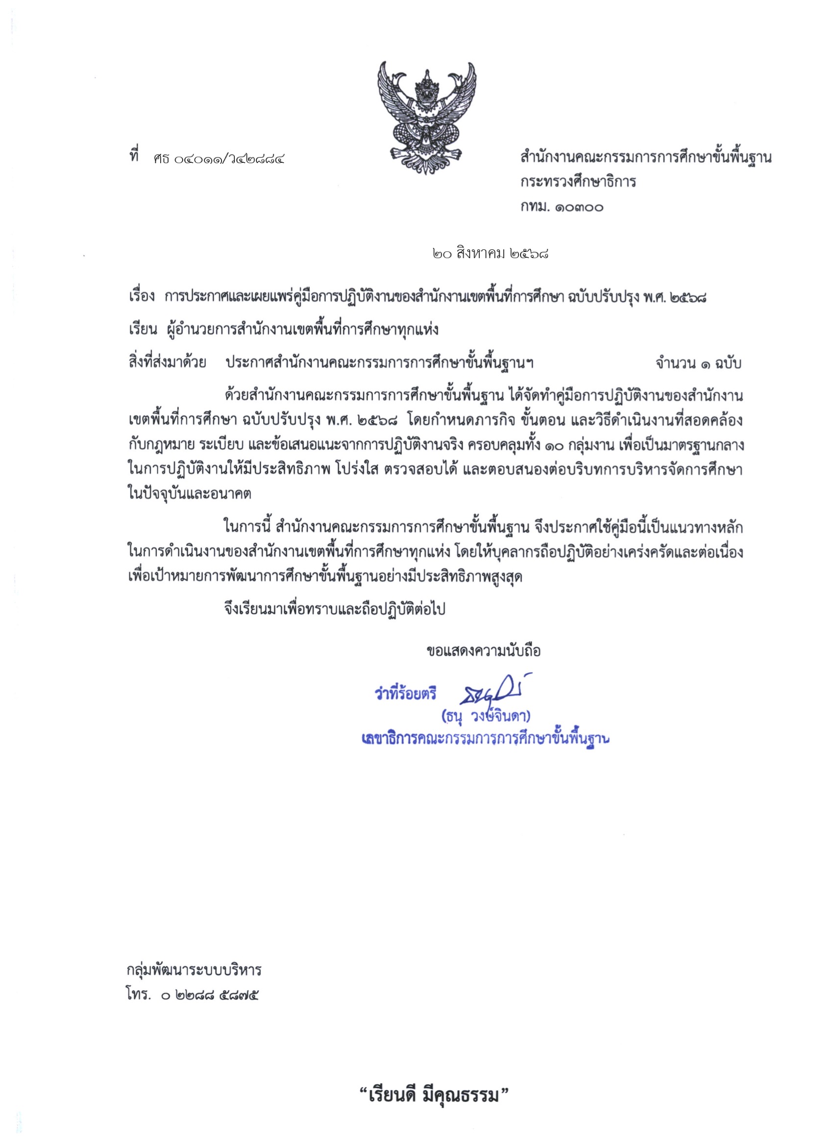 ด้วยสำนักงานคณะกรรมการการศึกษาขั้นพื้นฐาน ได้จัดทำคู่มือการปฏิบัติงานของสำนักงานเขตพื้นที่การศึกษา ฉบับปรับปรุง พ.ศ. ๒๕๖๘ โดยกำหนดภารกิจ ขั้นตอน และวิธีดำเนินงานที่สอดคล้อง กับกฎหมาย ระเบียบ และข้อเสนอแนะจากการปฏิบัติงานจริง ครอบคลุมทั้ง ๑๐ กลุ่มงาน เพื่อเป็นมาตรฐานกลางในการปฏิบัติงานให้มีประสิทธิภาพ โปร่งใส ตรวจสอบได้ และตอบสนองต่อบริบทการบริหารจัดการศึกษาในปัจจุบันและอนาคต