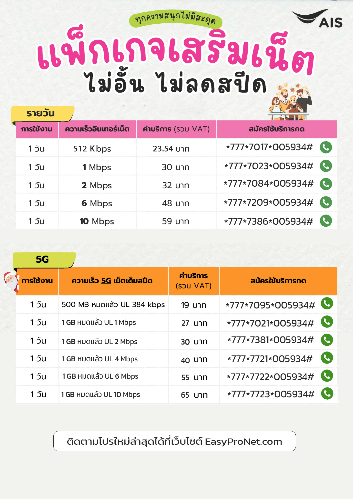 ตารางรวมแพ็กเกจ โปรเน็ต AIS 1 วัน ไม่ลดสปีด (อัปเดตล่าสุด)