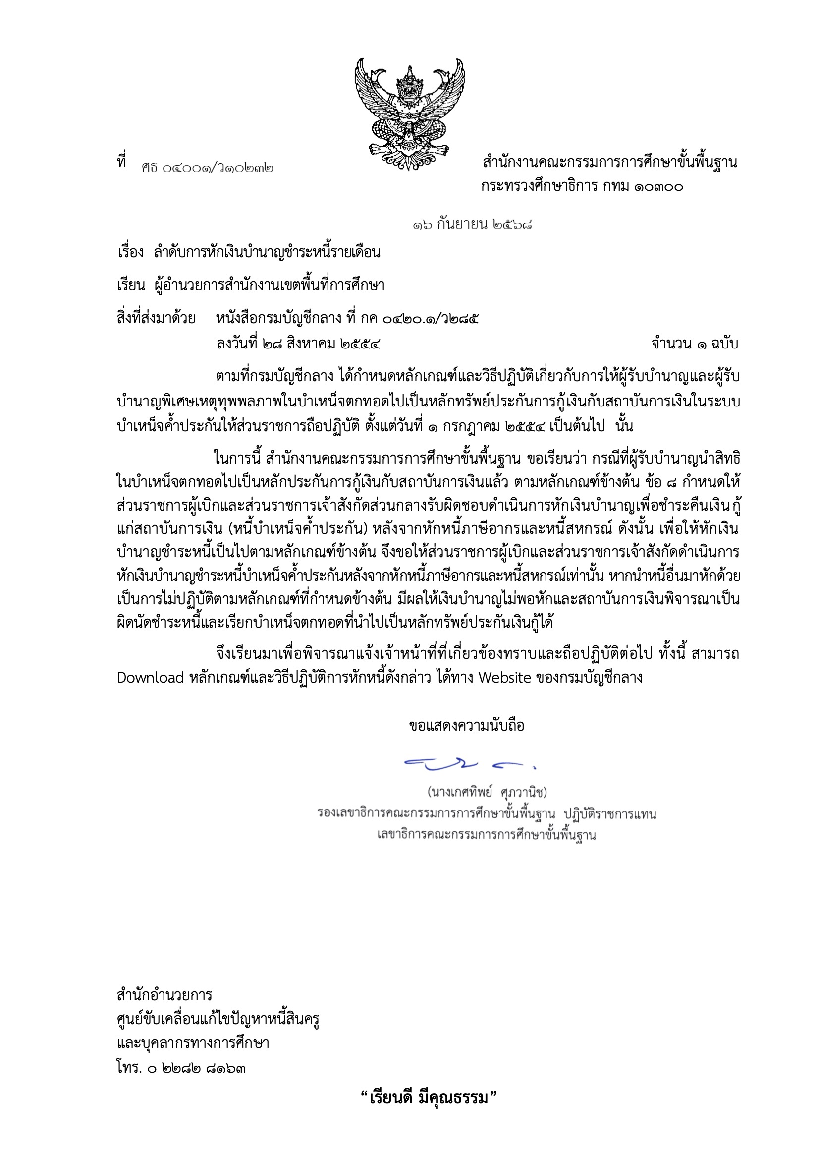 ในการนี้ สำนักงานคณะกรรมการการศึกษาขั้นพื้นฐาน ขอเรียนว่า กรณีที่ผู้รับบำนาญนำสิทธิ ในบำเหน็จตกทอดไปเป็นหลักประกันการกู้เงินกับสถาบันการเงินแล้ว ตามหลักเกณฑ์ข้างต้น ข้อ 8 กำหนดให้ส่วนราชการผู้เบิกและส่วนราชการเจ้าสังกัดส่วนกลางรับผิดชอบดำเนินการหักเงินบำนาญเพื่อชำระคืนเงินกู้แก่สถาบันการเงิน (หนี้บำเหน็จค้ำประกัน) หลังจากหักหนี้ภาษีอากรและหนี้สหกรณ์ ดังนั้น เพื่อให้หักเงินบำนาญชำระหนี้เป็นไปตามหลักเกณฑ์ข้างต้น จึงขอให้ส่วนราชการผู้เบิกและส่วนราชการเจ้าสังกัดดำเนินการ หักเงินบำนาญชำระหนี้บำเหน็จค้ำประกันหลังจากหักหนี้ภาษีอากรและหนี้สหกรณ์เท่านั้น หากนำหนี้อื่นมาหักด้วยเป็นการไม่ปฏิบัติตามหลักเกณฑ์ที่กำหนดข้างต้น มีผลให้เงินบำนาญไม่พอหักและสถาบันการเงินพิจารณาเป็น ผิดนัดชำระหนี้และเรียกบำเหน็จตกทอดที่นำไปเป็นหลักทรัพย์ประกันเงินกู้ได้