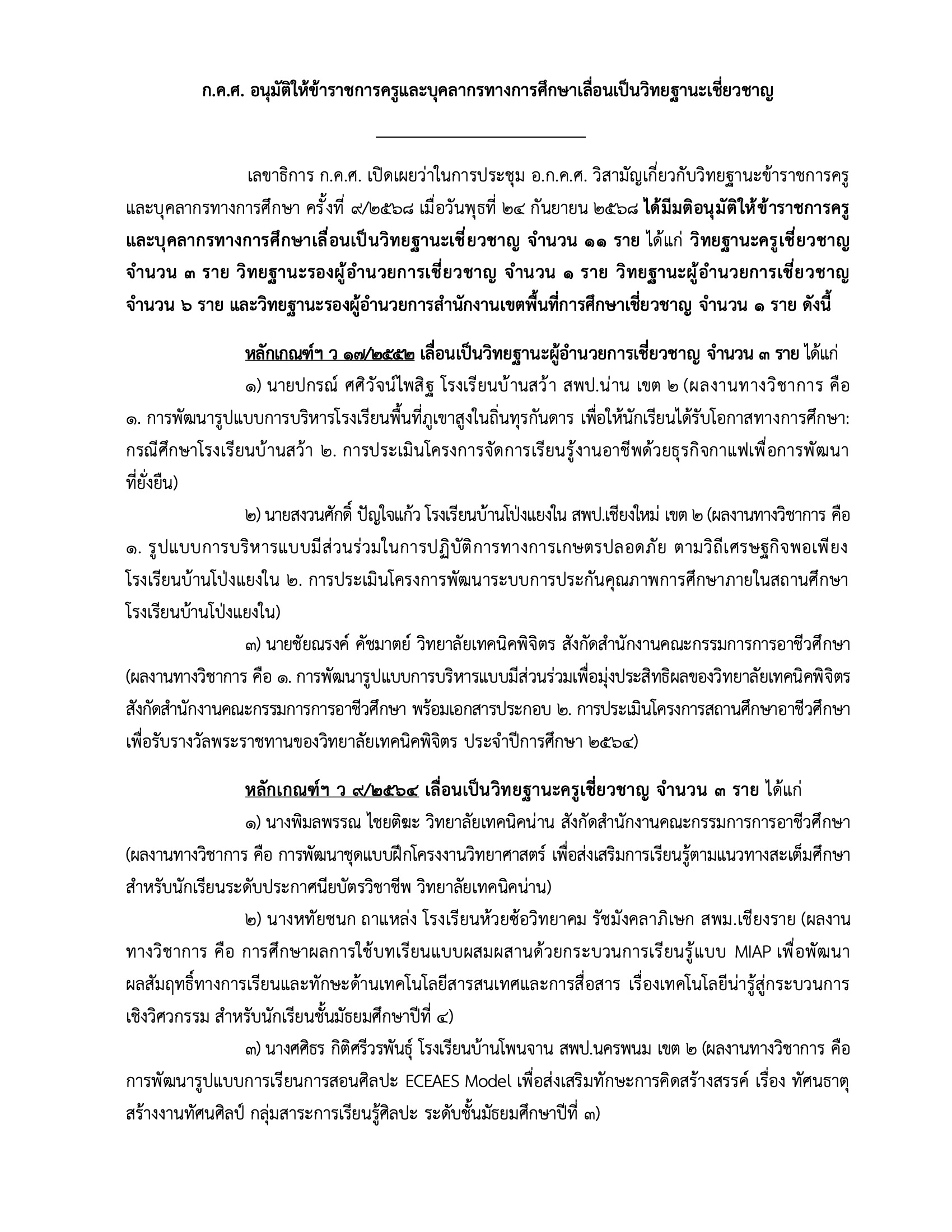 เลขาธิการ ก.ค.ศ.เปิดเผยว่า ในการประชุม อ.ก.ค.ศ.วิสามัญเกี่ยวกับวิทยฐานะข้าราชการครู และบุคลากรทางการศึกษา ครั้งที่ 9/2568 เมื่อวันพุธที่ 24 กันยายน 2568 ได้มีมติอนุมติให้ข้าราชการครู และบุคลากรทางการศึกษาเลื่อนเป็นวิทยฐานะเชี่ยวชาญ จำนวน 11 รายได้แก่