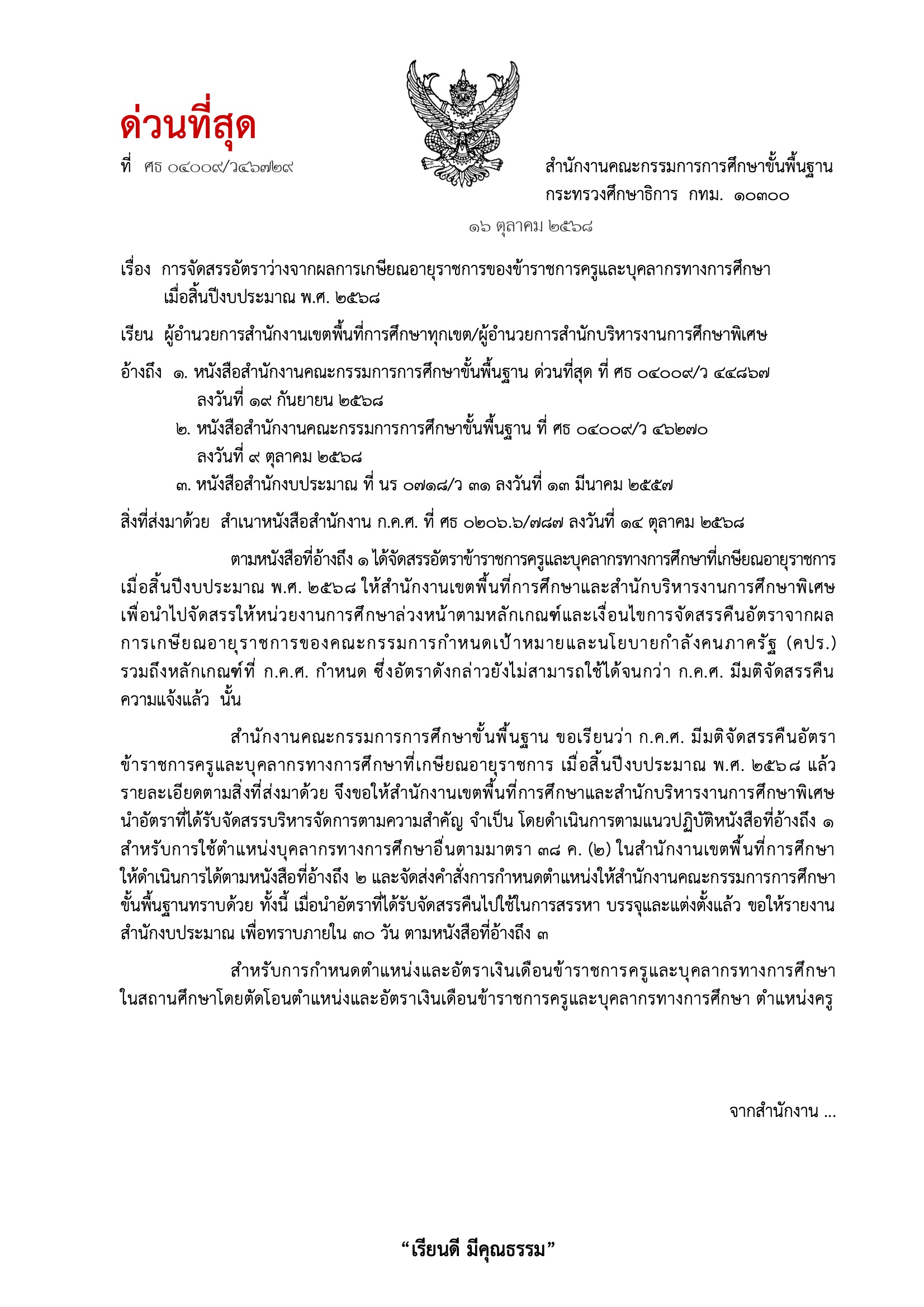 การจัดสรรอัตราว่างจากผลการเกษียณอายุราชการของข้าราชการครูและบุคลากรทางการศึกษา เมื่อสิ้นปีงบประมาณ พ.ศ. 2568