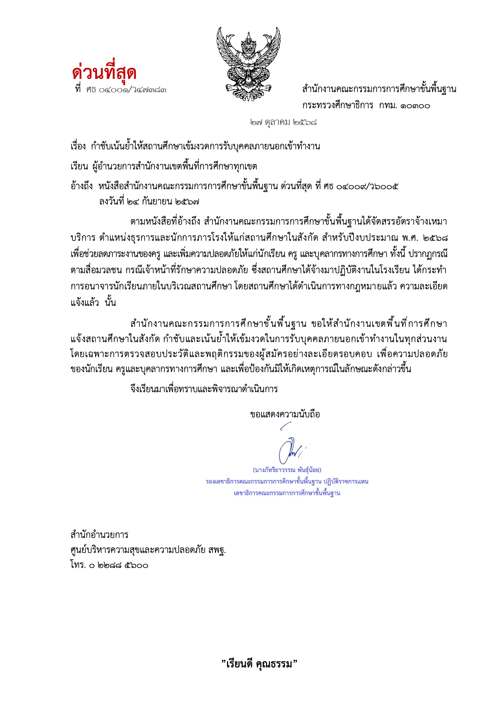 สำนักงานคณะกรรมการการศึกษาขั้นพื้นฐาน ได้มีหนังสือที่ ศธ 04001/ว5566 เรื่อง กำชับเน้นย้ำให้สถานศึกษาเข้มงวดการรับบุคคลภายนอกเข้าทำงาน