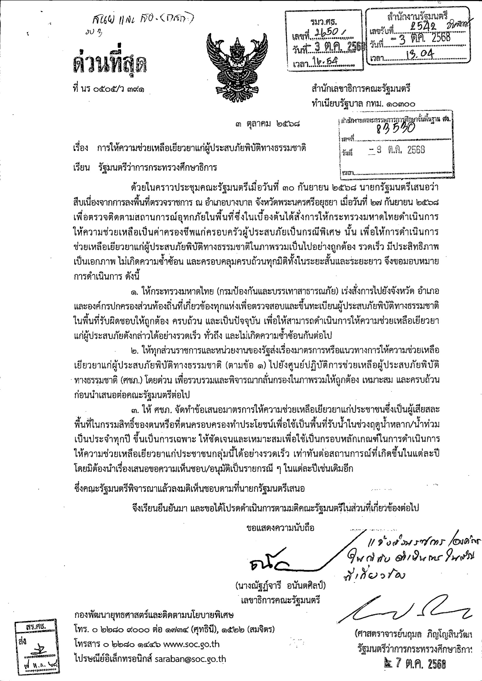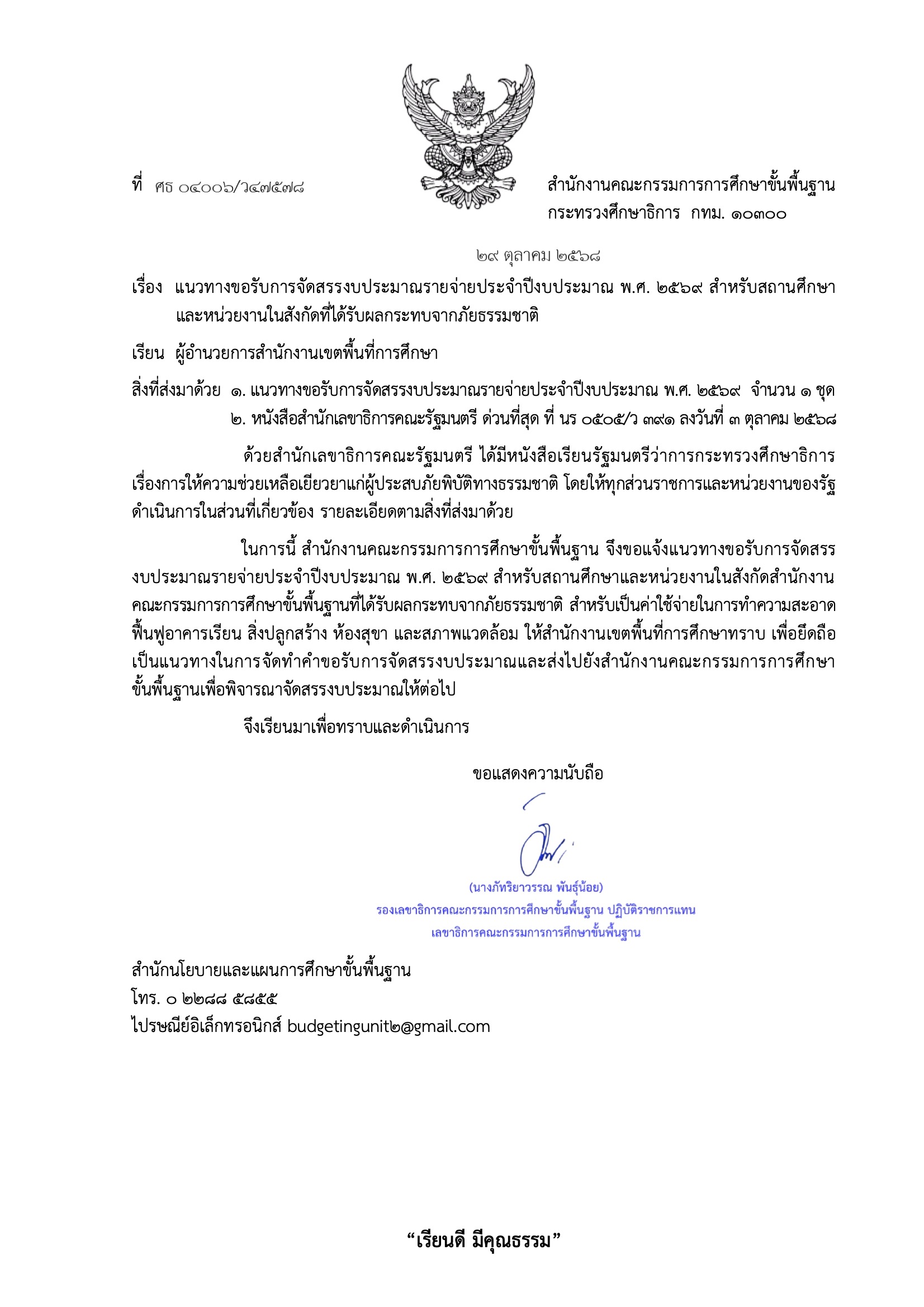 ที่ ศธ 04006/ว47578 เรื่อง แนวทางขอรับการจัดสรรงบประมาณรายจ่ายประจำปีงบประมาณ พ.ศ. 2569 สำหรับสถานศึกษาและหน่วยงานในสังกัดที่ได้รับผลกระทบจากภัยธรรมชาติ