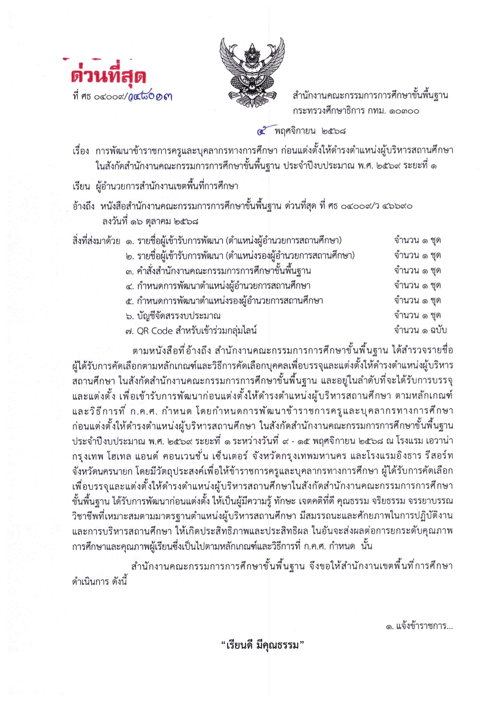 การพัฒนาข้าราชการครูและบุคลากรทางการศึกษา ก่อนแต่งตั้งให้ดำรงตำแหน่งผู้บริหารสถานศึกษาในสังกัดสำนักงานคณะกรรมการการศึกษาขั้นพื้นฐาน ประจำปีงบประมาณ พ.ศ. 2569 ระยะที่ 1