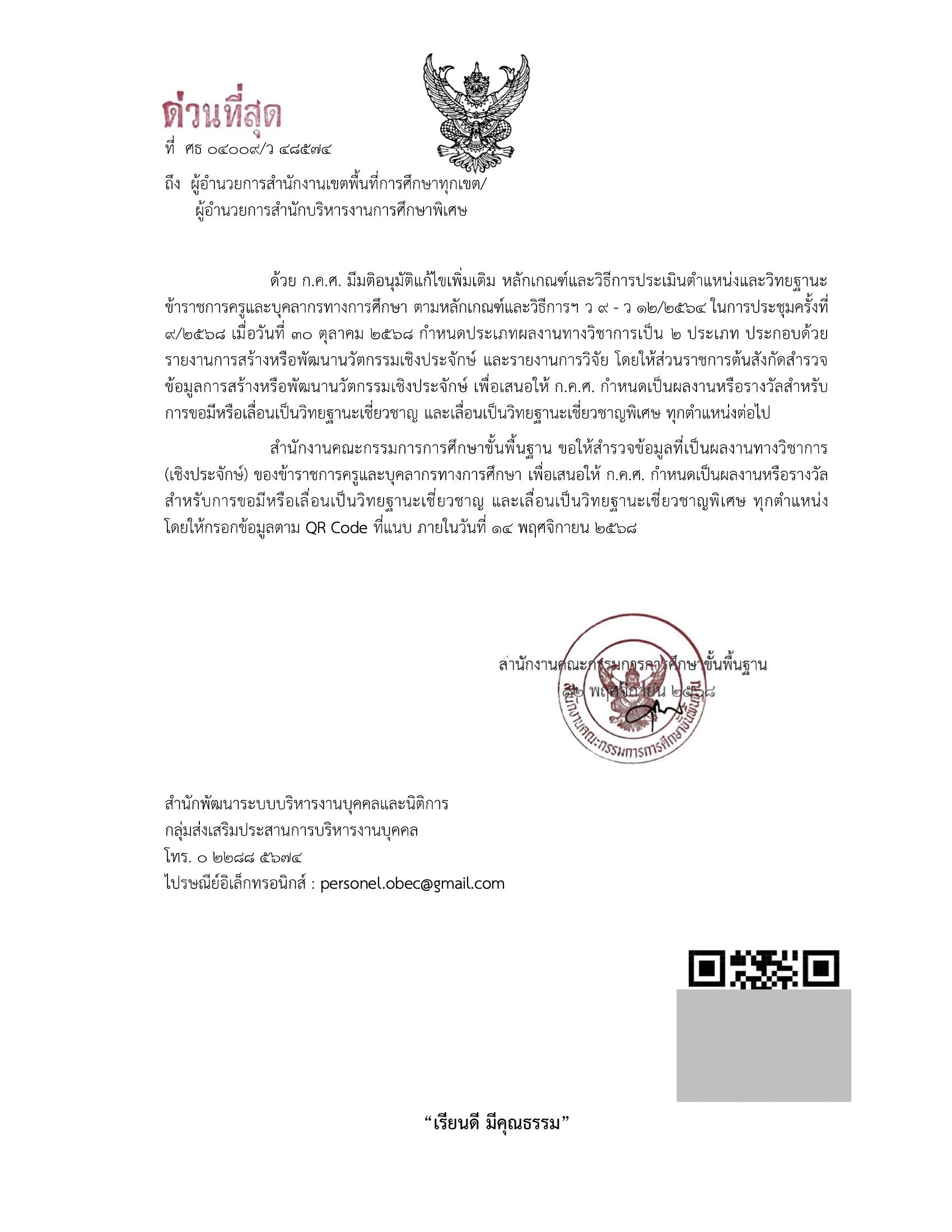 สำรวจข้อมูลการสร้างหรือพัฒนานวัตกรรมเชิงประจักษ์ เพื่อเสนอให้ ก.ค.ศ. กำหนดเป็นผลงานหรือรางวัลสำหรับการขอมีหรือเลื่อนเป็นวิทยฐานะเชี่ยวชาญ และเลื่อนเป็นวิทยฐานะเชี่ยวชาญพิเศษ ทุกตำแหน่ง