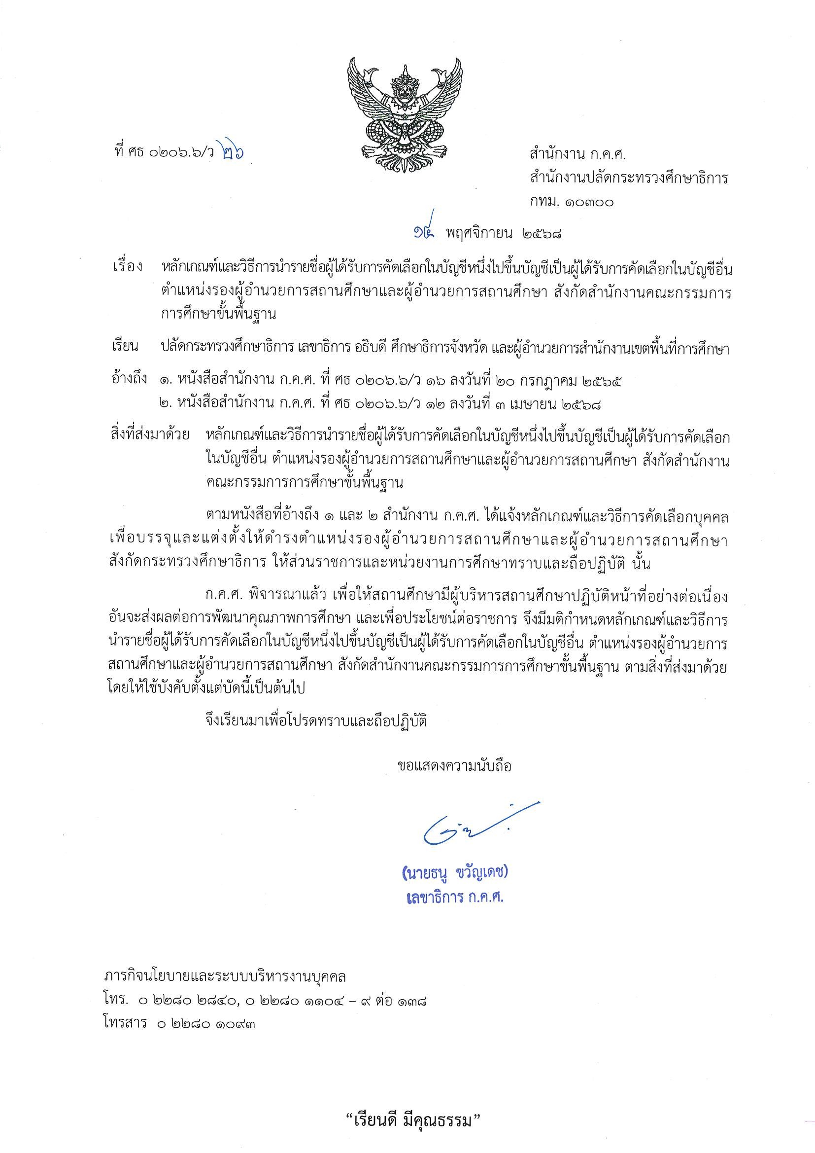 ว 26/2568 หลักเกณฑ์และวิธีการนำรายชื่อผู้ได้รับการคัดเลือกในบัญชีหนึ่งไปขึ้นบัญชีเป็นผู้ได้รับการคัดเลือกในบัญชีอื่น ตำแหน่งรองผู้อำนวยการสถานศึกษา และผู้อำนวยการสถานศึกษา สังกัด สพฐ.