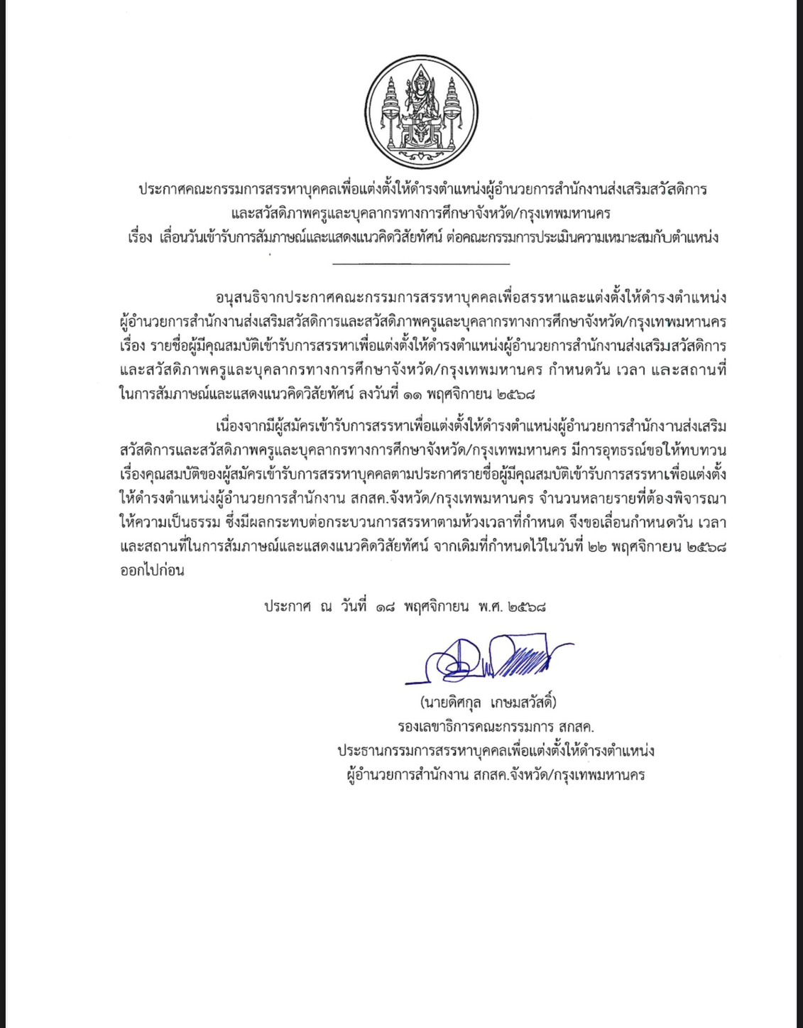 เมื่อวันที่ 18 พ.ย.2568 ผู้สื่อข่าวรายงานว่า เว็บไซต์ สำนักงานส่งเสริมสวัสดิการและสวัสดิภาพครูและบุคลากรทางการศึกษา(สำนักงานสกสค.)ได้ประกาศเลื่อนวันเข้ารับการสัมภาษณ์และแสดงแนวคิดวิสัยทัศน์ ต่อคณะกรรมการประเมินความเหมาะสมกับตำแหน่งผู้อำนวยการสำนักงานส่งเสริมสวัสดิการและสวัสดิภาพครูและบุคลากรทางการศึกษาจังหวัด/กรุงเทพมหานคร จากเดิมที่กำหนดไว้ในวันที่ 22 พฤศจิกายน 2568 ออกไปก่อนแบบไม่มีกำหนดเวลา ลงนามโดย ดร.ดิศกุล เกษมสวัสดิ์ รองเลขาธิการสำนักงาน สกสค.ในฐานะประธานกรรมการสรรหาฯ