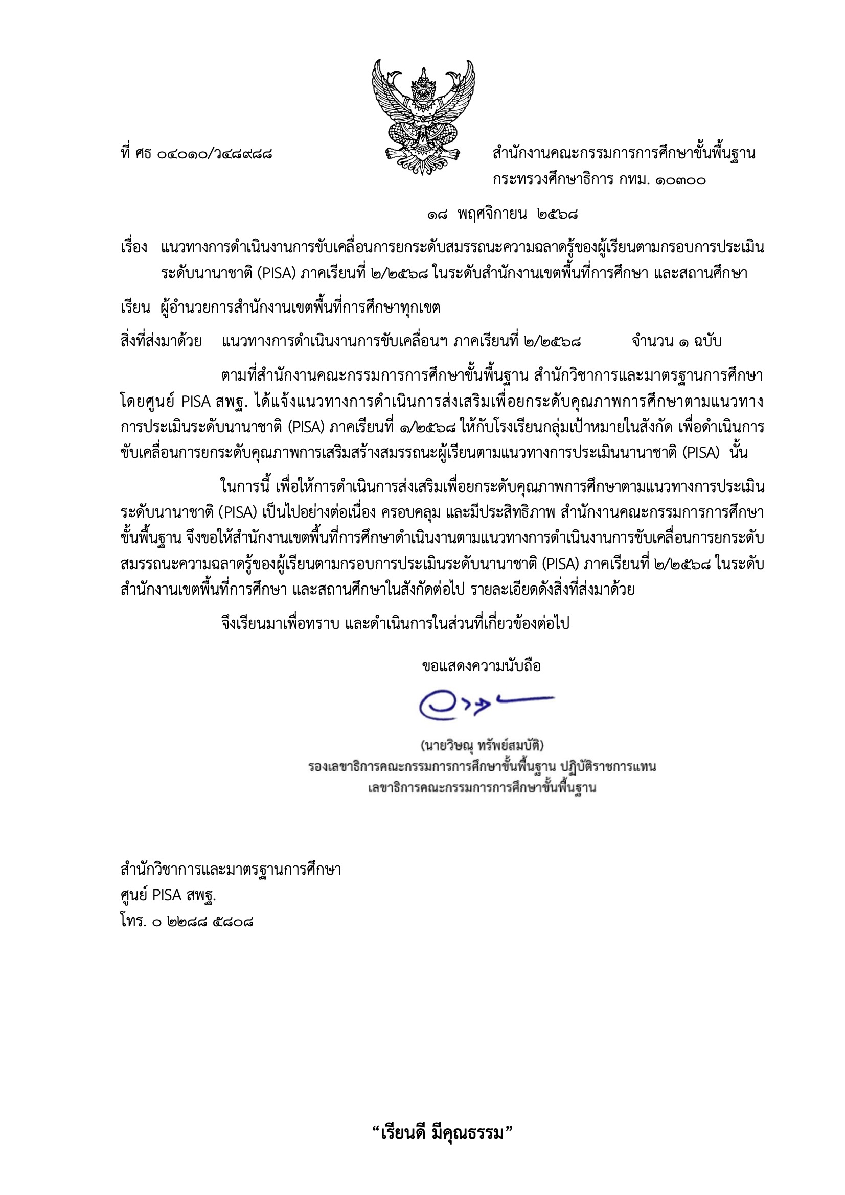 แนวทางการดำเนินงานการขับเคลื่อนการยกระดับสมรรถนะความฉลาดรู้ของผู้เรียนตามกรอบการประเมินระดับนานาชาติ (PISA) ภาคเรียนที่ 2/2568 ในระดับสำนักงานเขตพื้นที่การศึกษา และสถานศึกษา