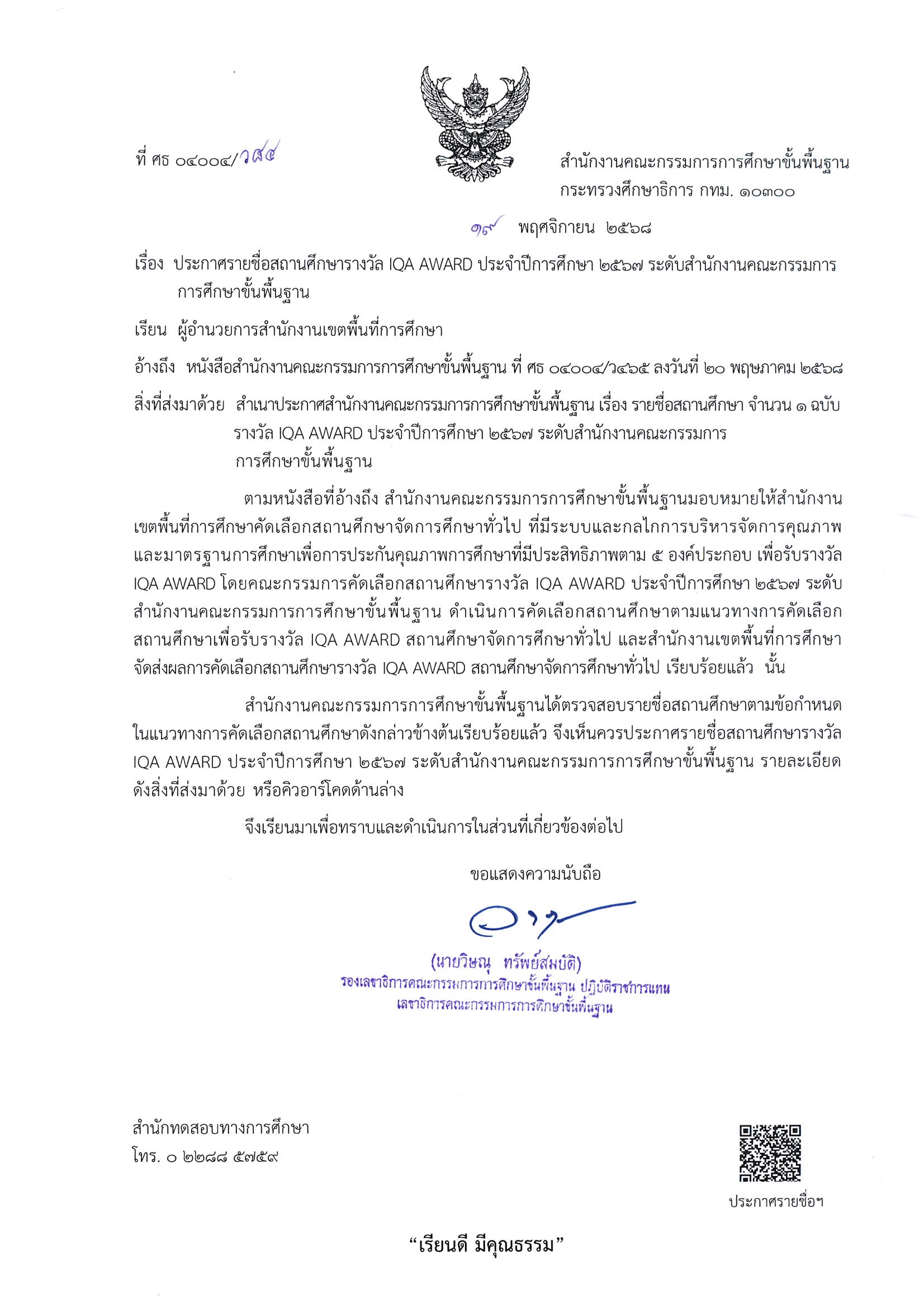 สพฐ. ลงนามประกาศรายชื่อสถานศึกษารางวัล IQA AWARD ประจำปีการศึกษา 2567 ระดับสำนักงานคณะกรรมการการศึกษาขั้นพื้นฐาน ตามหนังสือ สพฐ. ที่ ศธ 04004/ว84 ลงวันที่ 19 พฤศจิกายน 2568