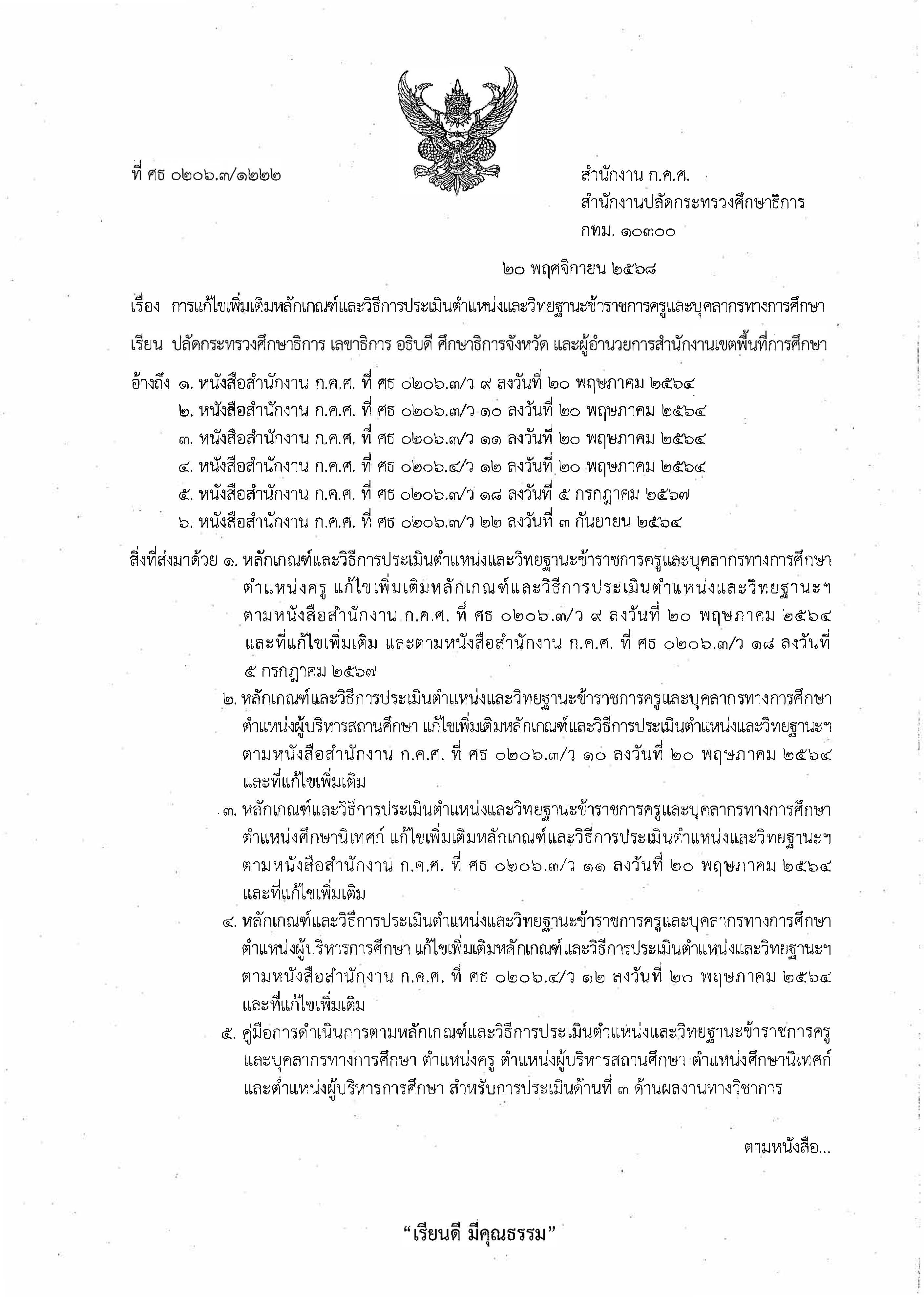 สำนักงาน ก.ค.ศ. มีหนังสือที่ ศธ.0206.3/1222 หรือ หนังสือลงวันที่ 1222/2568 เรื่อง การแก้ไขเพิ่มเติมหลักเกณฑ์และวิธีการประเมินตำแหน่งและวิทยฐานะข้าราชการครูและบุคลากรทางการศึกษา (ว 9 - ว 12/2564 และ ว 18/2567)