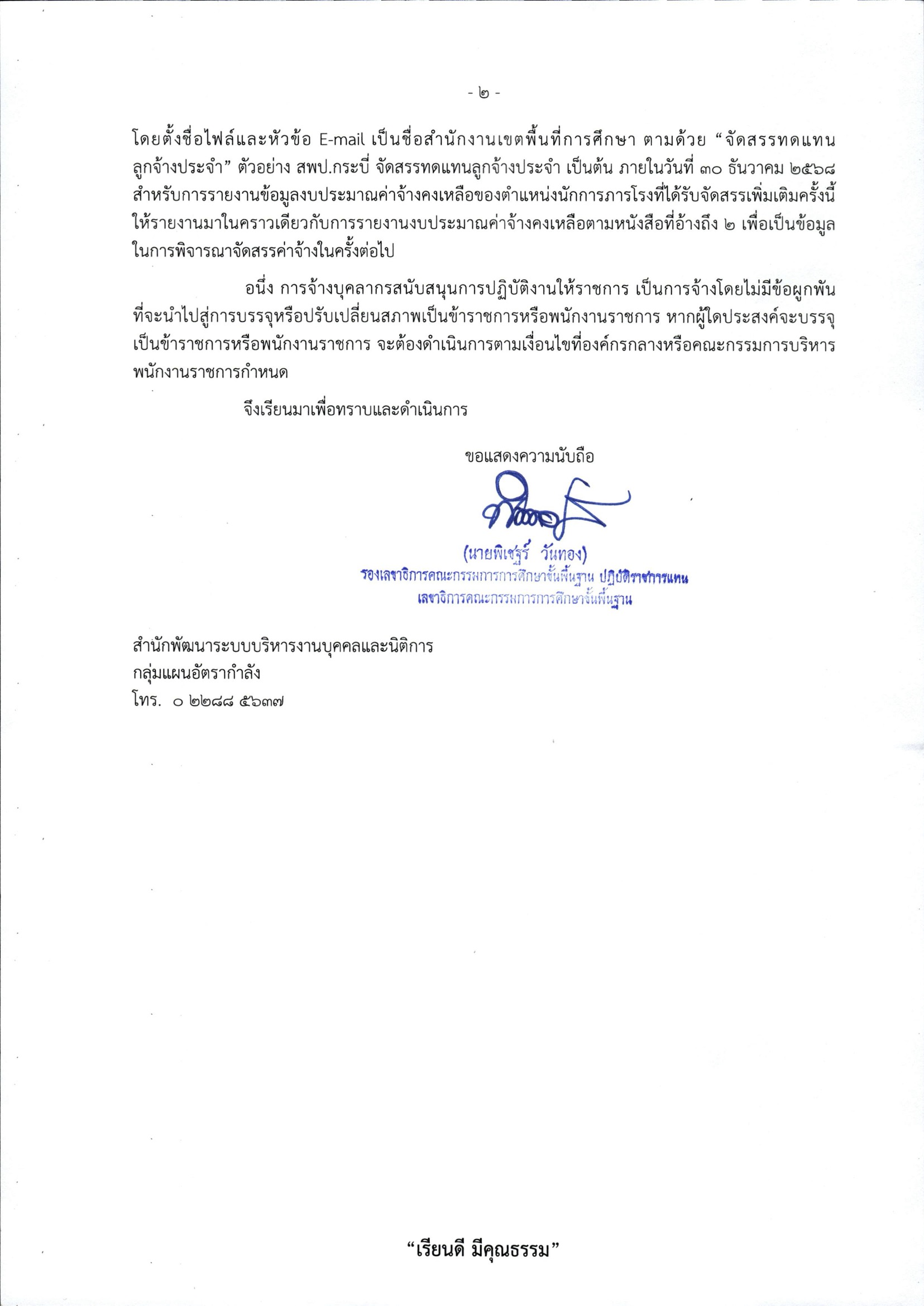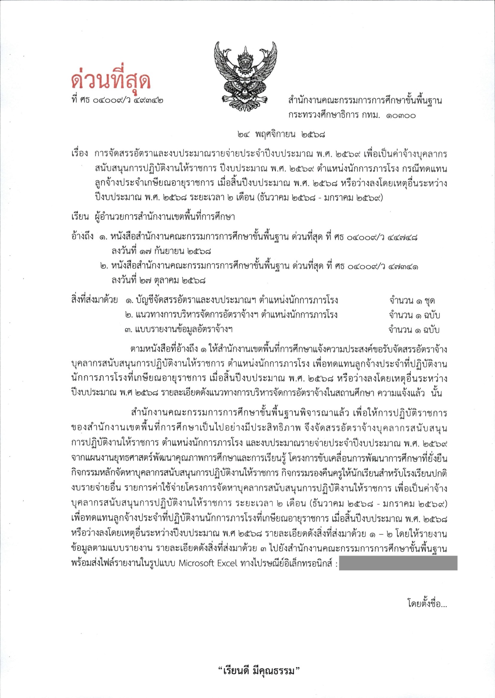 ด่วนที่สุด เรื่อง การจัดสรรอัตราและงบประมาณรายจ่ายประจำปีงบประมาณ พ.ศ. 2569 เพื่อเป็นค่าจ้างบุคลากรสนับสนุนการปฏิบัติงานให้ราชการ ปีงบประมาณ พ.ศ. 2569 ตำแหน่งนักการภารโรง กรณีทดแทนลูกจ้างประจำเกษียณอายุราชการ
