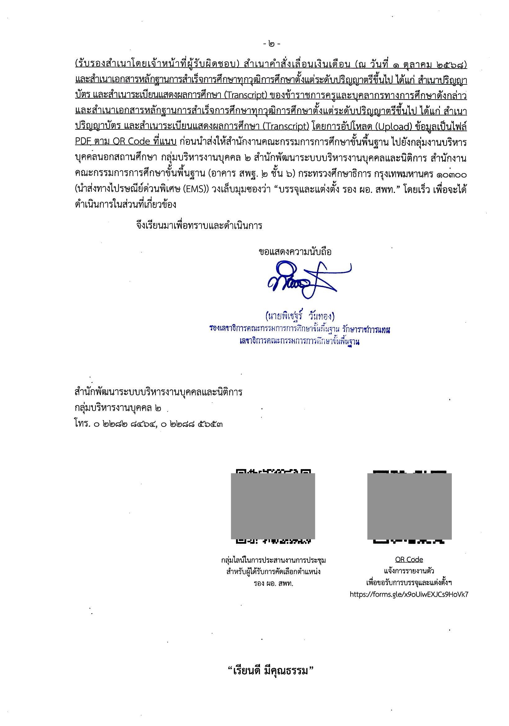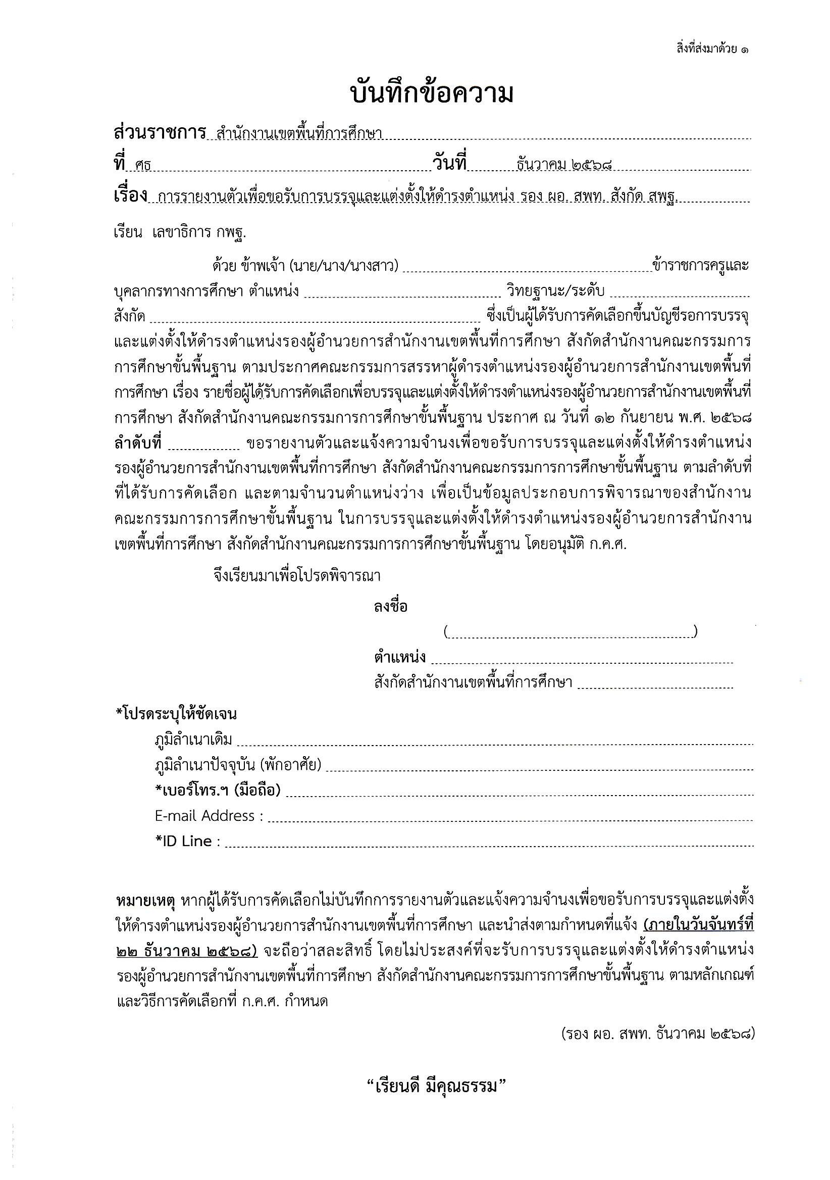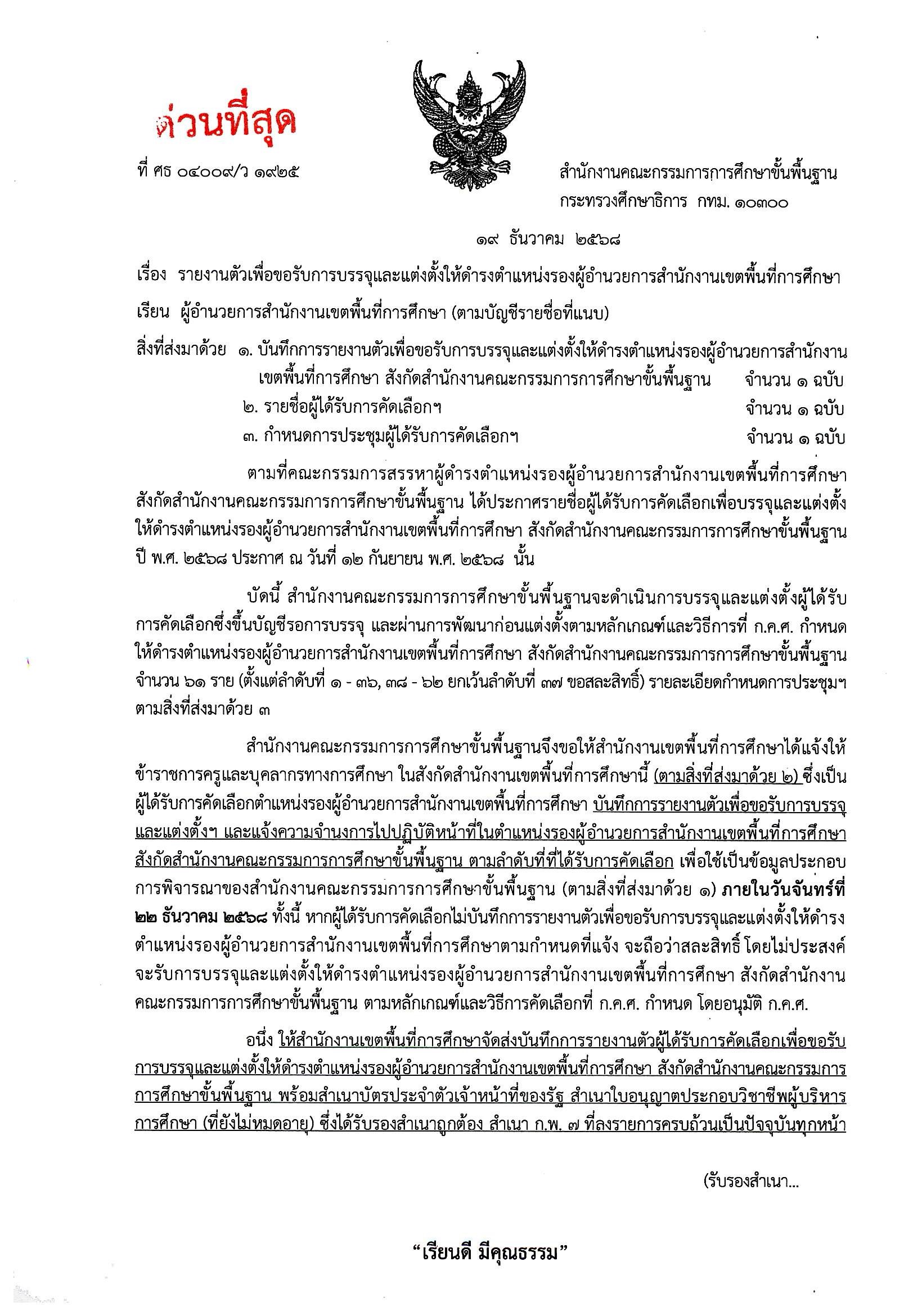 เมื่อวันที่ 19 ธันวาคม 2568 สำนักงานคณะกรรมการการศึกษาขั้นพื้นฐาน มีหนังสือ ศธ 04009/ว1925 เรื่อง รายงานตัวเพื่อขอรับการบรรจุและแต่งตั้งให้ดำรงตำแหน่ง รองผู้อำนวยการสำนักงานเขตพื้นที่การศึกษา
