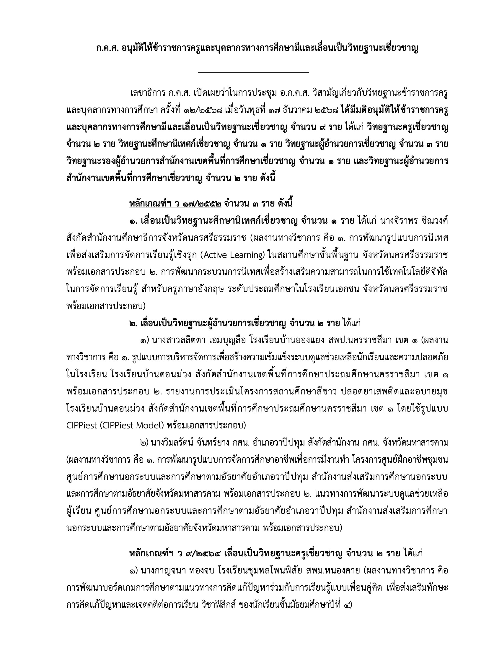 เมื่อวันที่ 17 ธันวาคม 2568 เลขาธิการ ก.ค.ศ. เปิดเผยผลการประชุม อ.ก.ค.ศ. วิสามัญเกี่ยวกับวิทยฐานะข้าราชการครูและบุคลากรทางการศึกษา ครั้งที่ 12/2568 ซึ่งมีมติอนุมัติให้ข้าราชการครูและบุคลากรทางการศึกษาเลื่อนเป็นวิทยฐานะเชี่ยวชาญ จำนวนทั้งสิ้น 9 ราย โดยแบ่งตามสายงานประกอบด้วย
