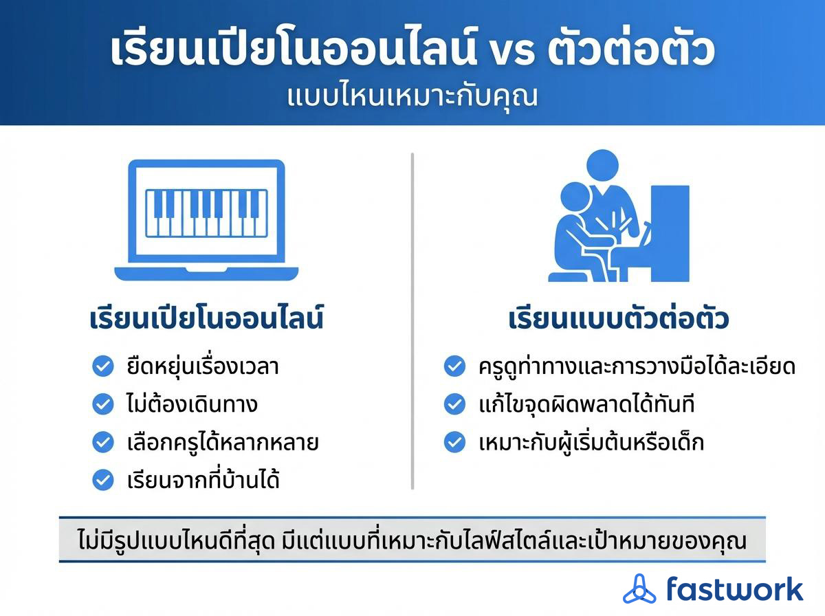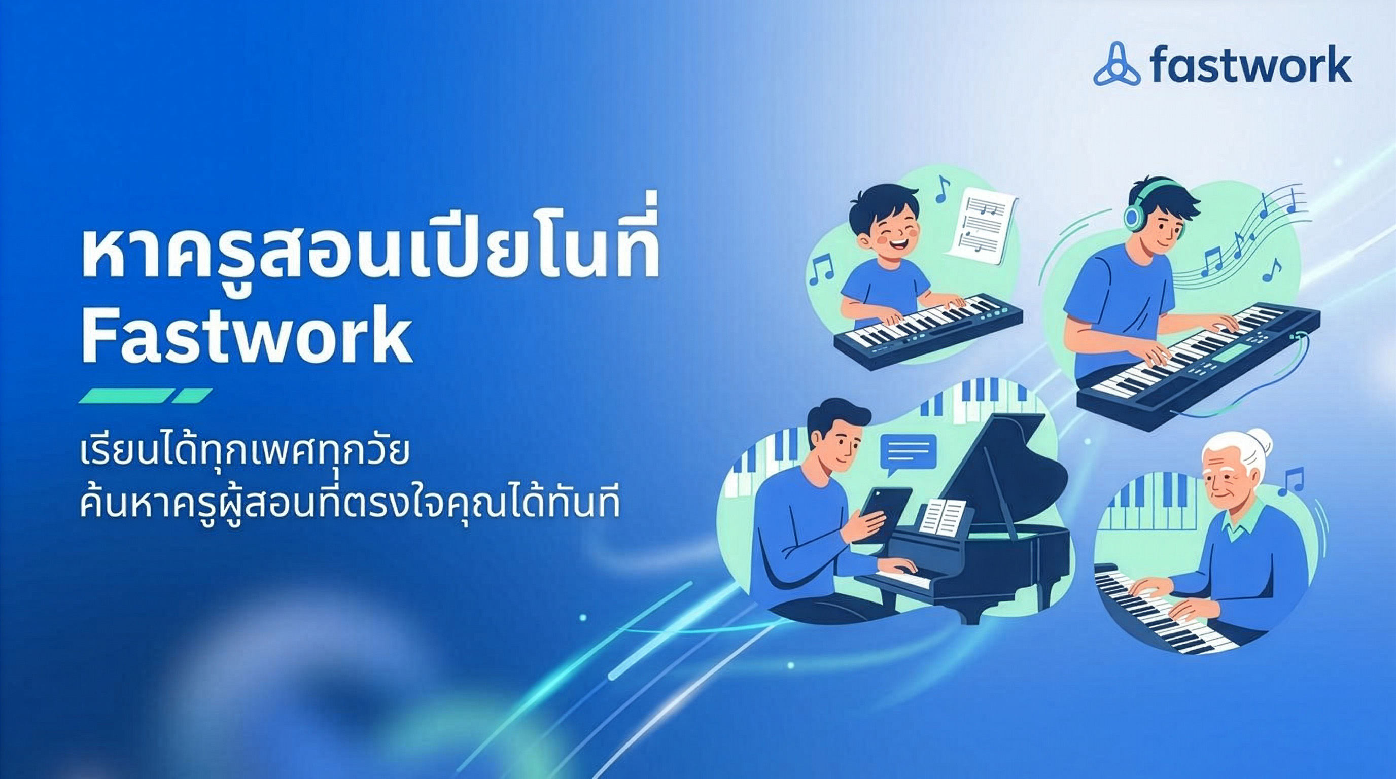 สำหรับผู้ที่สนใจ เรียนเปียโน ไม่ว่าจะเป็นมือใหม่ที่เพิ่งเริ่มต้นหรือผู้ที่ต้องการพัฒนาทักษะให้มีความรู้มากขึ้น ปัจจุบันมีทางเลือกให้คุณได้มีการค้นหาครูสอนเปียโนที่หลากหลายมากขึ้น ผ่านแพลตฟอร์มอย่าง Fastwork ซึ่งรวบรวมครูและผู้ให้บริการด้านทักษะจากหลายแนวทาง ผู้เรียนสามารถพิจารณาและเลือกครูเปียโน รวมถึงรูปแบบการเรียนที่สอดคล้องกับเป้าหมายเวลาและไลฟ์สไตล์ของตัวเองได้อย่างยืดหยุ่น