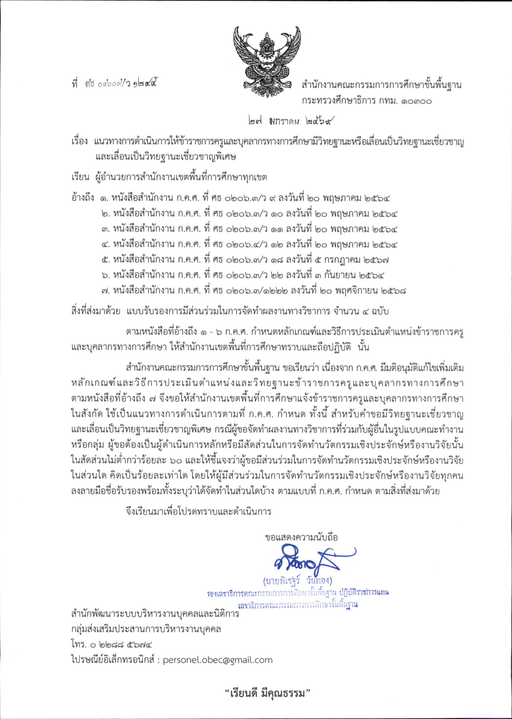 ที่ ศธ 04009/ว 1245 ลงวันที่ 27 มกราคม 2569 เรื่อง แนวทางการดำเนินการให้ข้าราชการครูและบุคลากรทางการศึกษามีวิทยฐานะหรือเลื่อนเป็นวิทยฐานะเชี่ยวชาญและเลื่อนเป็นวิทยฐานะเชี่ยวชาญพิเศษ