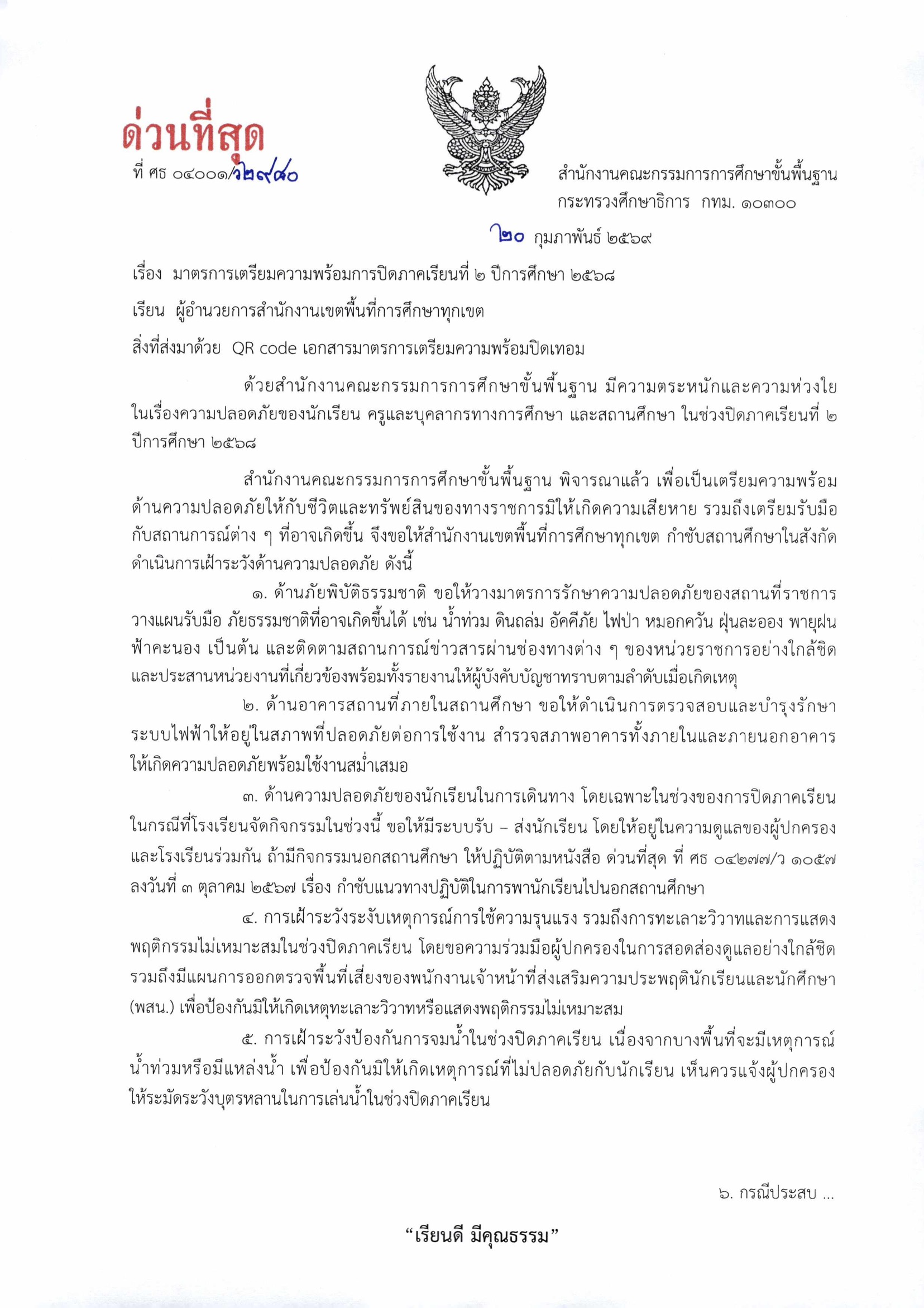 มาตรการเตรียมความพร้อมการปิดภาคเรียนที่ 2 ปีการศึกษา 2568มาตรการเตรียมความพร้อมการปิดภาคเรียนที่2ปีการศึกษา2568