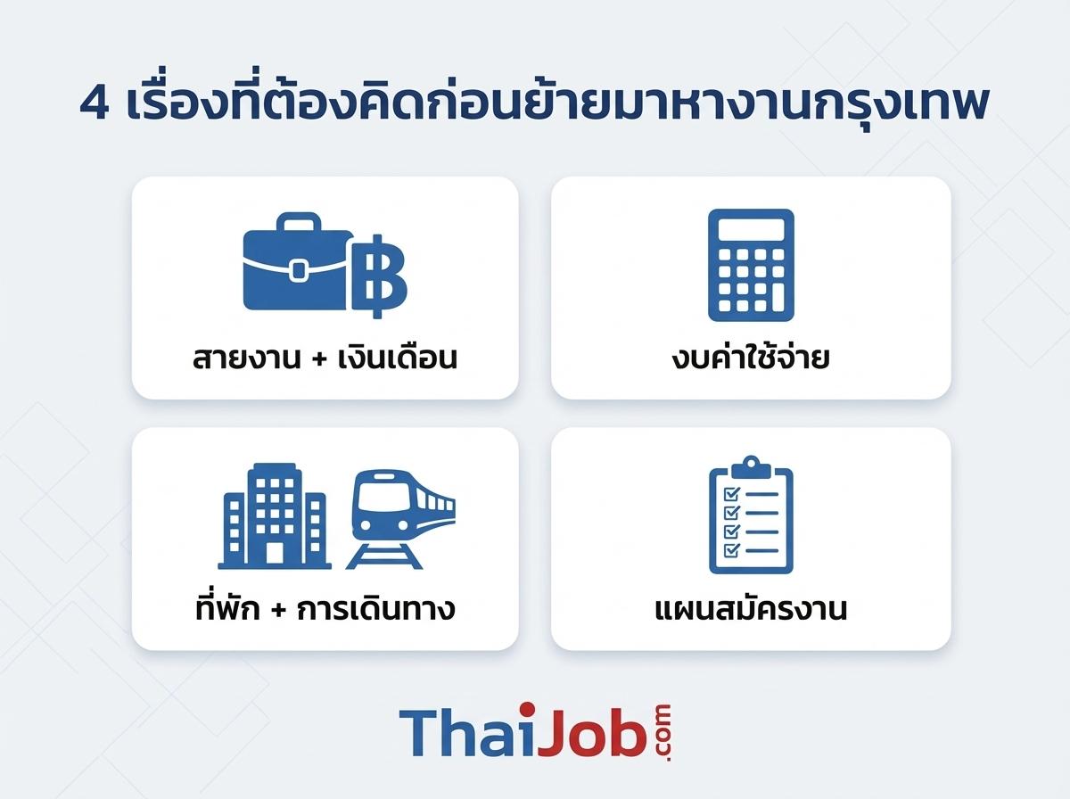 การเตรียมตัวหางานกรุงเทพแบบเป็นระบบ ลองเริ่มจาก 4 เรื่องหลักที่ควรคิดให้ชัดก่อน ทั้งการเลือกสายงานที่เหมาะกับตัวเองและตั้งเป้าเงินเดือนให้สอดคล้องกับความเป็นจริง การวางแผนค่าใช้จ่ายในแต่ละเดือนเพื่อไม่ให้เงินเก็บหายไปเร็วเกินไป รวมถึงการเลือกที่พักและเส้นทางเดินทางที่พอไหวในระยะยาว