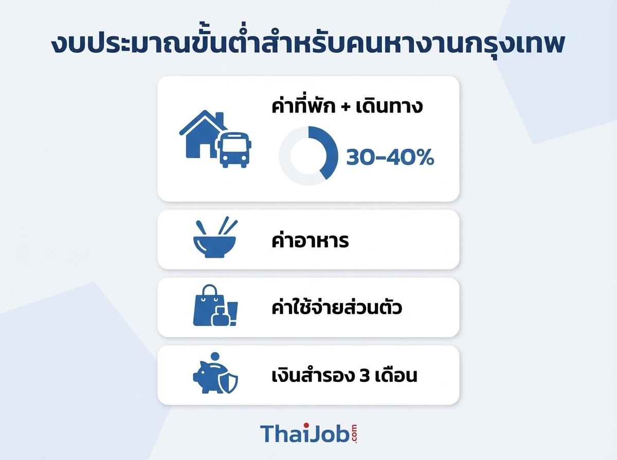 การย้ายมาหางานกรุงเทพโดยไม่มีตัวเลขในใจถือว่าเสี่ยงพอสมควร เพราะค่าครองชีพที่นี่สามารถทำให้เงินเก็บลดลงเร็วมากถ้าไม่ได้วางแผนเรื่องค่าใช้จ่ายให้ดี การตั้งงบประมาณจึงไม่ใช่แค่ช่วยให้ประหยัด แต่ช่วยให้คุณอยู่ในกรุงเทพได้โดยไม่ต้องกังวลเรื่องเงิน