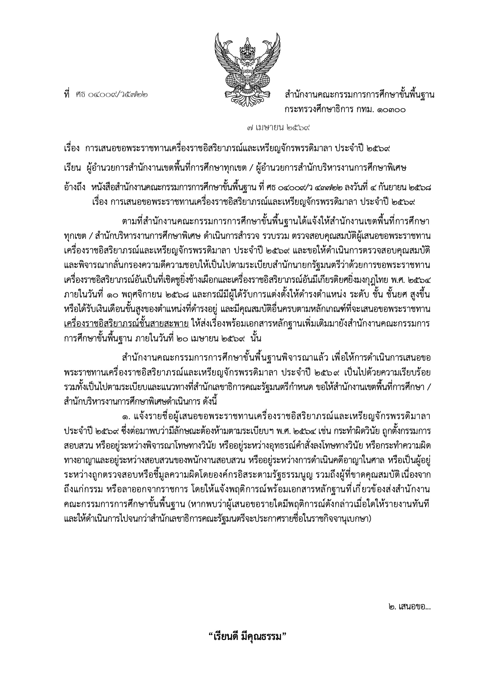 การเสนอขอพระราชทานเครื่องราชอิสริยาภรณ์และเหรียญจักรพรรดิมาลา ประจำปี 2569 (เพิ่มเติม)การเสนอขอพระราชทานเครื่องราชอิสริยาภรณ์และเหรียญจักรพรรดิมาลาประจำปี2569(เพิ่มเติม)