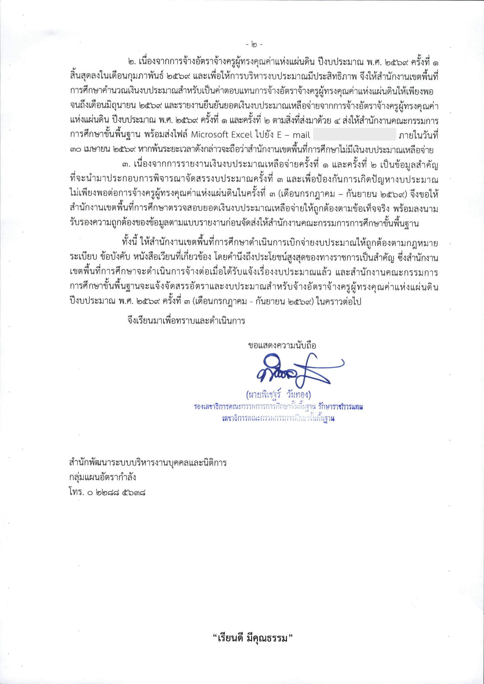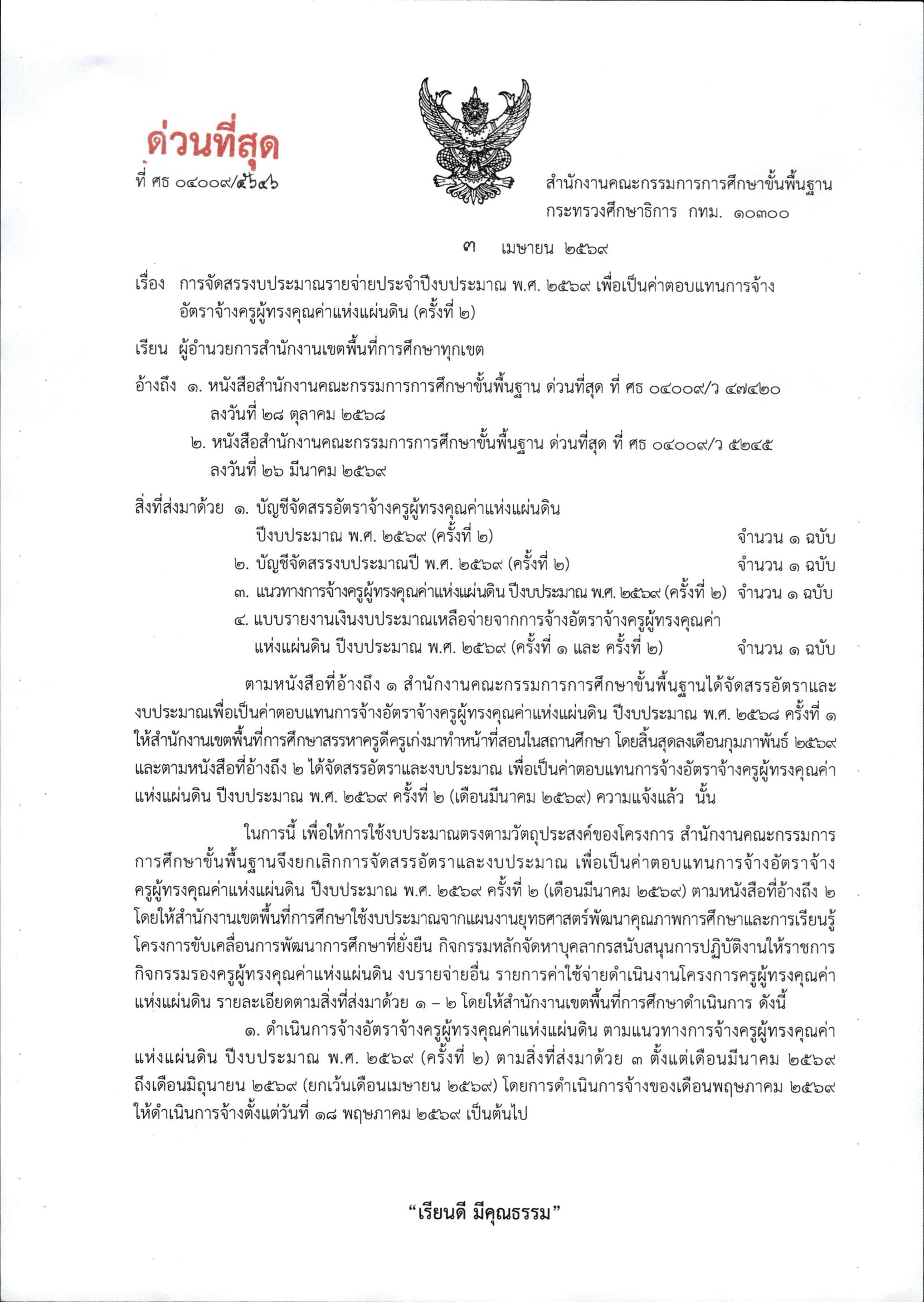 สำนักงานคณะกรรมการการศึกษาขั้นพื้นฐาน แจ้งการจัดสรรงบประมาณรายจ่ายประจำปีงบประมาณ พ.ศ. 2569 เพื่อเป็นค่าตอบแทนการจ้างอัตราจ้างครูผู้ทรงคุณค่าแห่งแผ่นดิน (ครั้งที่ 2)