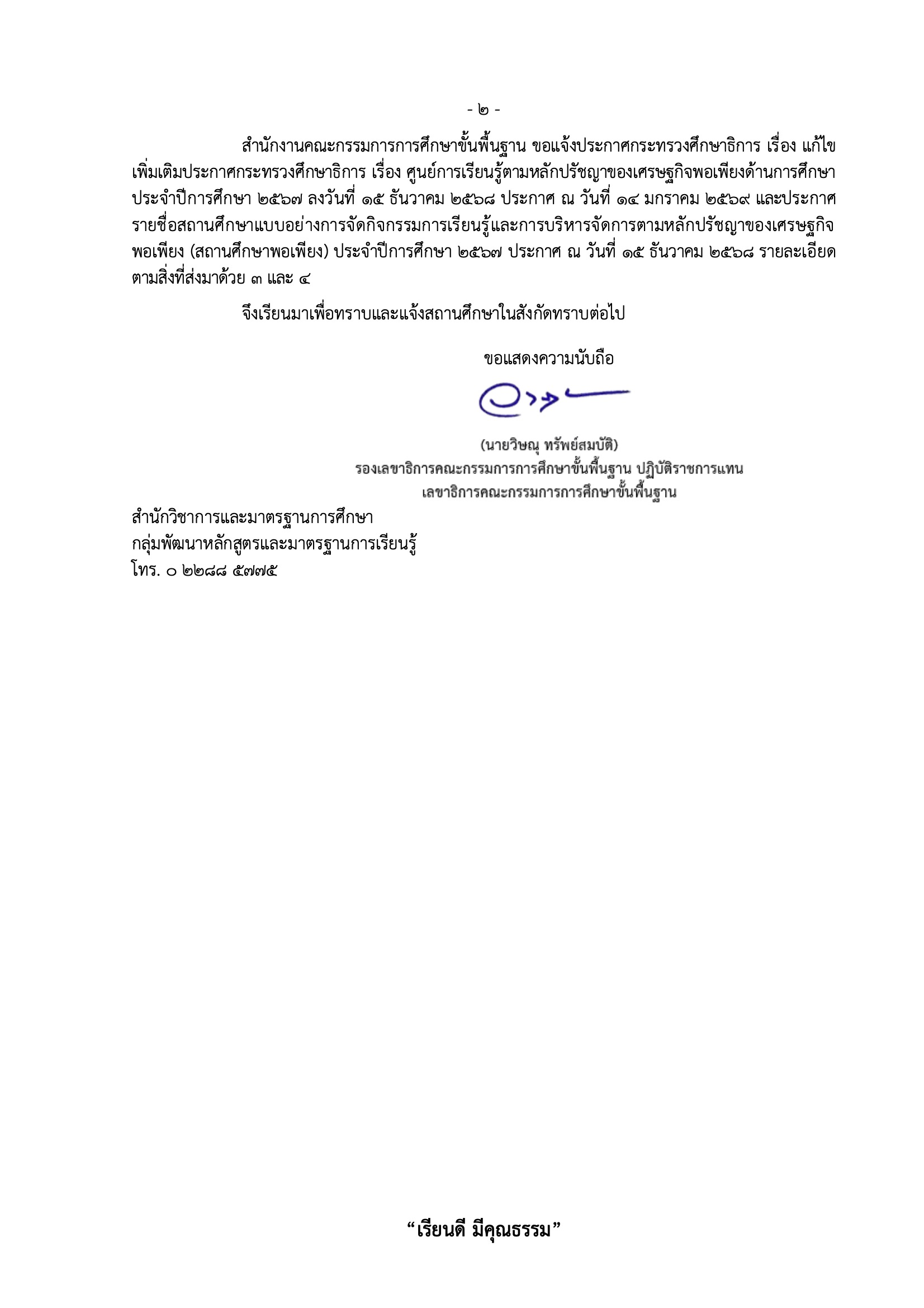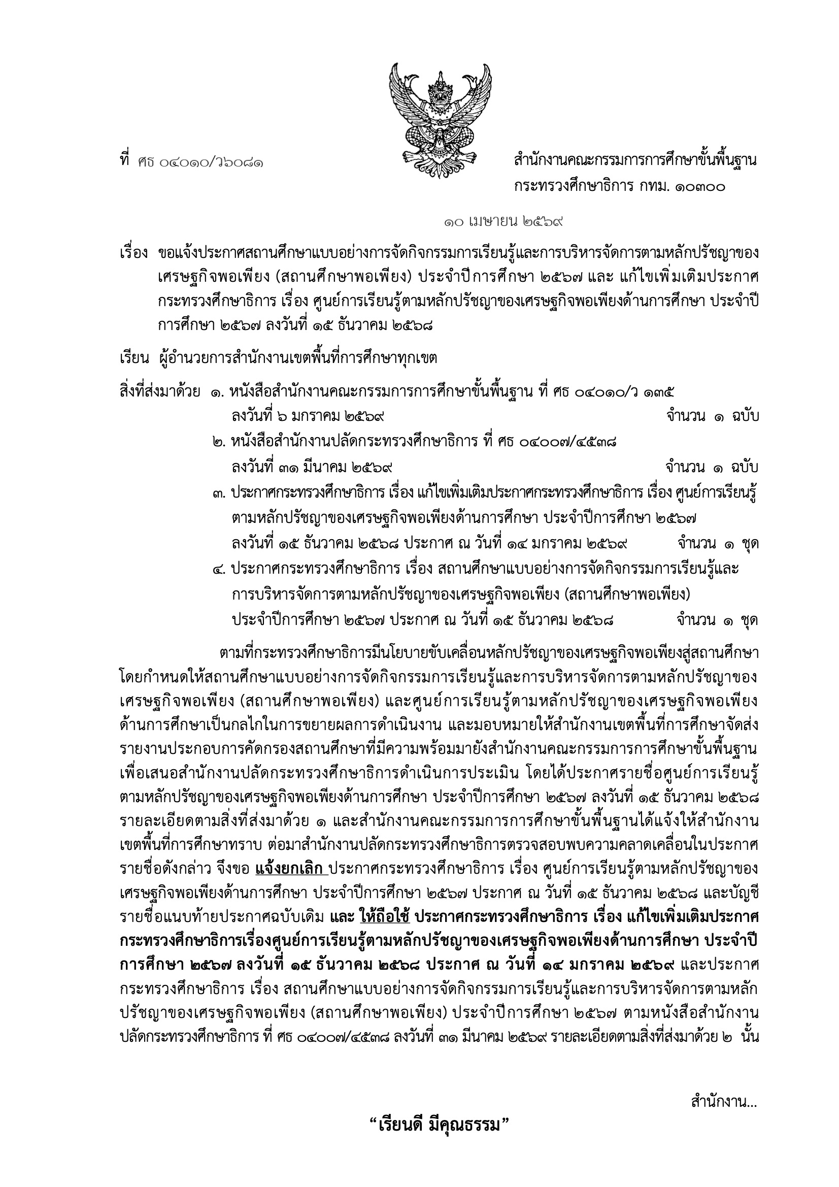 ประกาศสถานศึกษาแบบอย่างการจัดกิจกรรมการเรียนรู้และการบริหารจัดการตามหลักปรัชญาของเศรษฐกิจพอเพียง (สถานศึกษาพอเพียง) ประจำปีการศึกษา ๒๕๖๗ และ แก้ไขเพิ่มเติมประกาศ กระทรวงศึกษาธิการ เรื่อง ศูนย์การเรียนรู้ตามหลักปรัชญาของเศรษฐกิจพอเพียงด้านการศึกษา ประจำปีการศึกษา ๒๕๖๗ ลงวันที่ ๑๕ ธันวาคม ๒๕๖๘