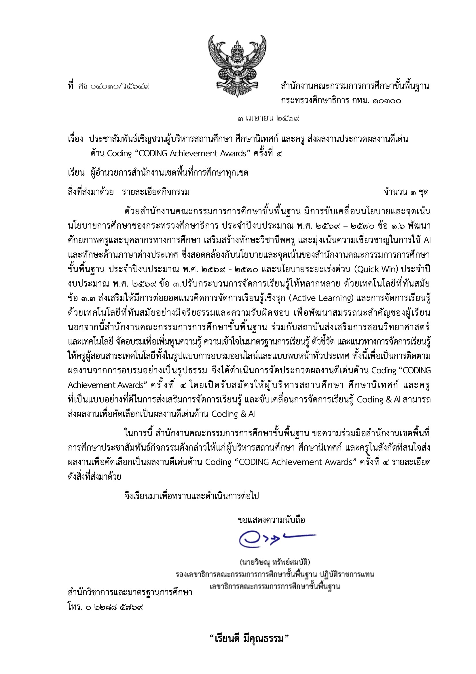 เชิญชวนผู้บริหารสถานศึกษา ศึกษานิเทศก์ และครู ส่งผลงานประกวดผลงานดีเด่นด้าน Coding "CODING Achievement Awards" ครั้งที่ 4