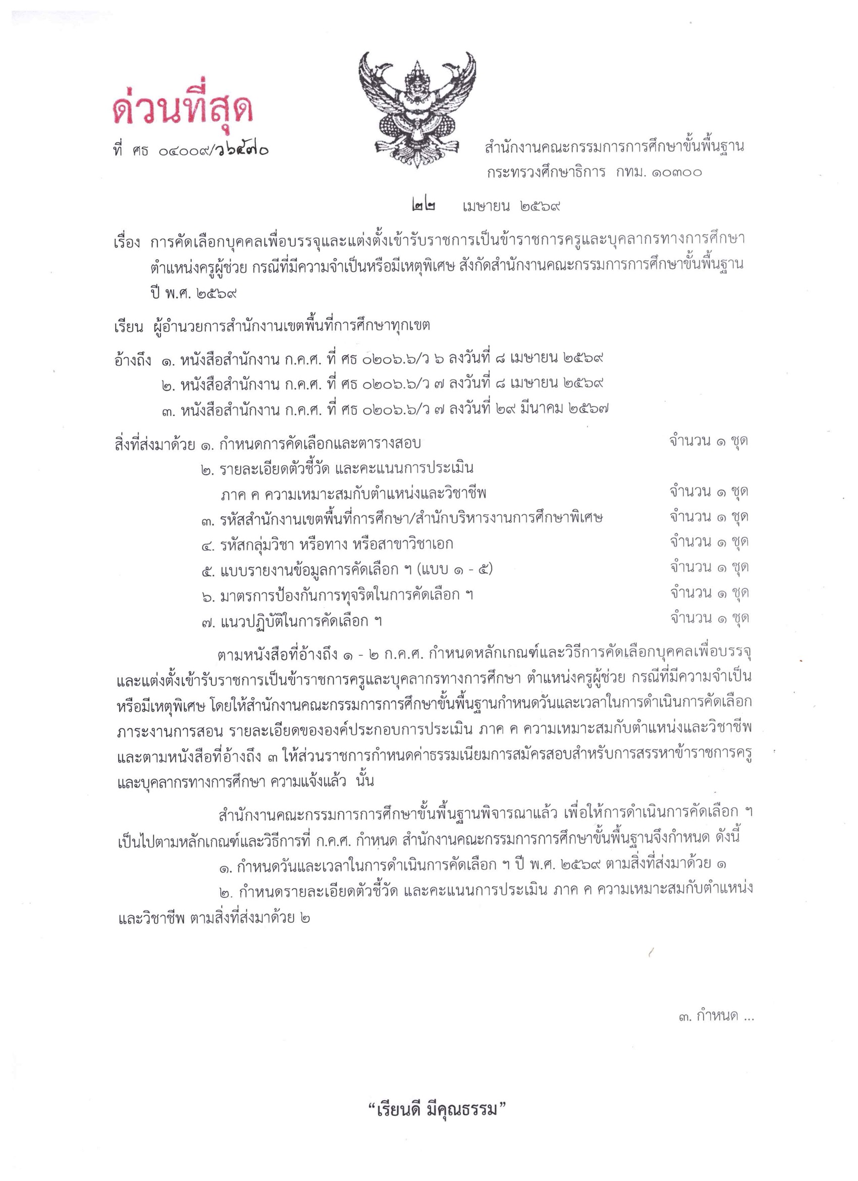 สำนักงานคณะกรรมการการศึกษาขั้นพื้นฐาน มีหนังสือ ด่วนที่สุด ที่ ศธ ศธ 04009/ว 6570 เรื่อง การคัดเลือกบุคคลเพื่อบรรจุและแต่งตั้งเข้ารับราชการเป็นข้าราชการครูและบุคลากรทางการศึกษา ตำแหน่งครูผู้ช่วย กรณีที่มีความจำเป็นหรือมีเหตุพิเศษ สังกัดสำนักงานคณะกรรมการการศึกษาขั้นพื้นฐาน ปี พ.ศ. 2569